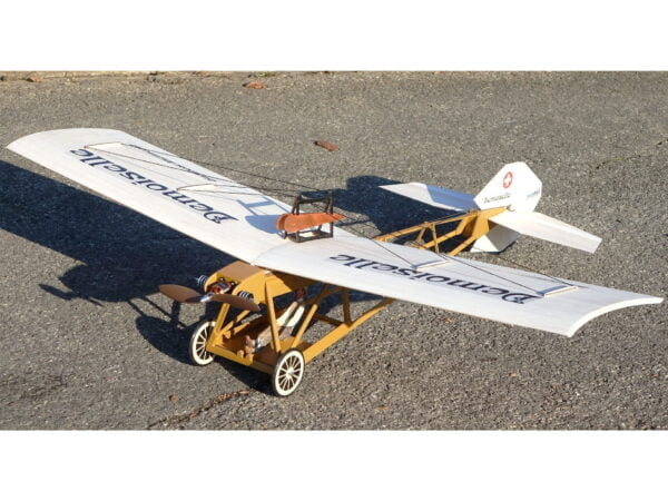 Der Bausatz der Demoiselle besticht durch die genial einfache Bauweise von Rumpf und Leitwerken mit nur drei verschiedenen Holzarten. Die Tragfläche ist nicht mit Holm und Rippen aufgebaut, sondern in einer ganz neuartigen Brettchen-Bauweise.