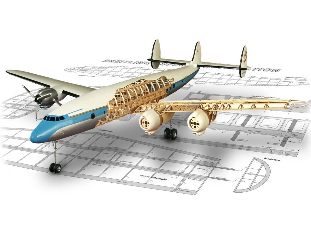 Um die Connie möglichst originalgetreu fliegen zu können, besitzt sie nebst den Querrudern auch zwei grosszügig dimensionierte Landeklappen. Damit das Modell einfach zu transoptieren ist, haben wir die Flügel abnehmbar und auch teilbar konstruiert. Auch das Leitwerk ist sehr einfach abnehmbar. Die Super-Connie wird komplett in Holz aufgebaut und auch komplett mit Balsaholz beplankt. Dieses Modell ist nicht komplizierter im Aufbau als andere Modelle, hat aber wesentlich mehr Einzelteile, die den Zusammenbau recht aufwendig gestalten. Überzeugende Originalabmessungen waren die ersten Prioritäten bei der Konstruktion dieses Modells.