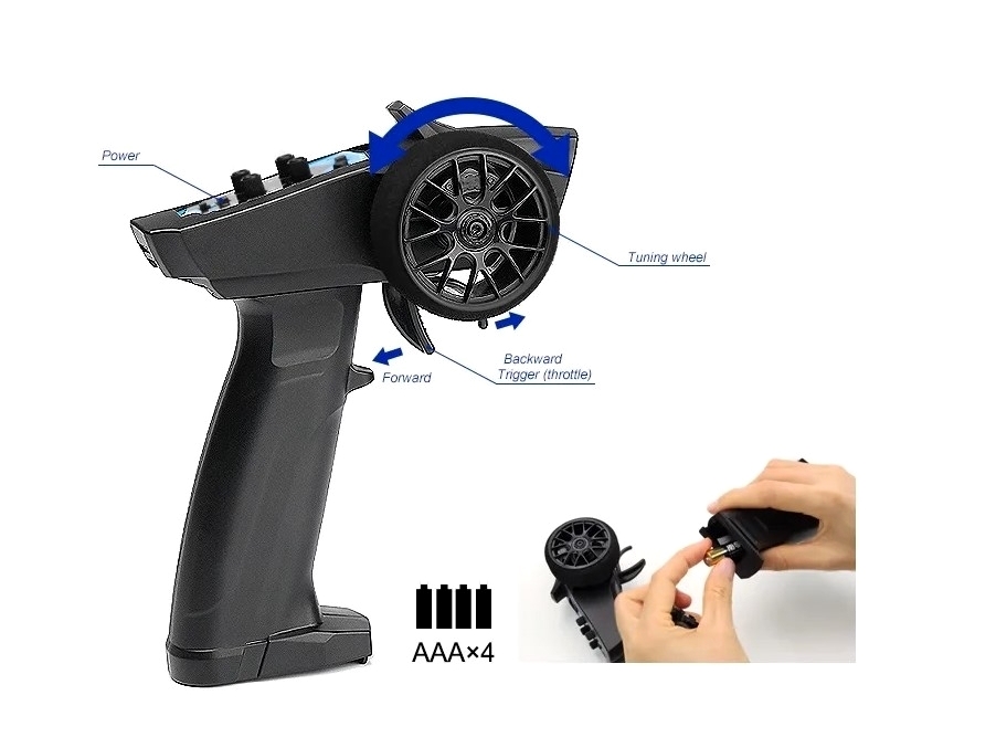 Der eingebaute LiPo-Akku sorgt für langen Fahrspass und intensiven Wettbewerb. Durch die integrierte USB-C Buchse kann das Fahrzeug einfach über ein Natel-Ladegerät, eine Powerbank oder einen Computer wieder aufgeladen werden. Gesteuert wird der Racer über eine kleine und handliche 2.4Ghz Pistolen-Fernsteuerung.