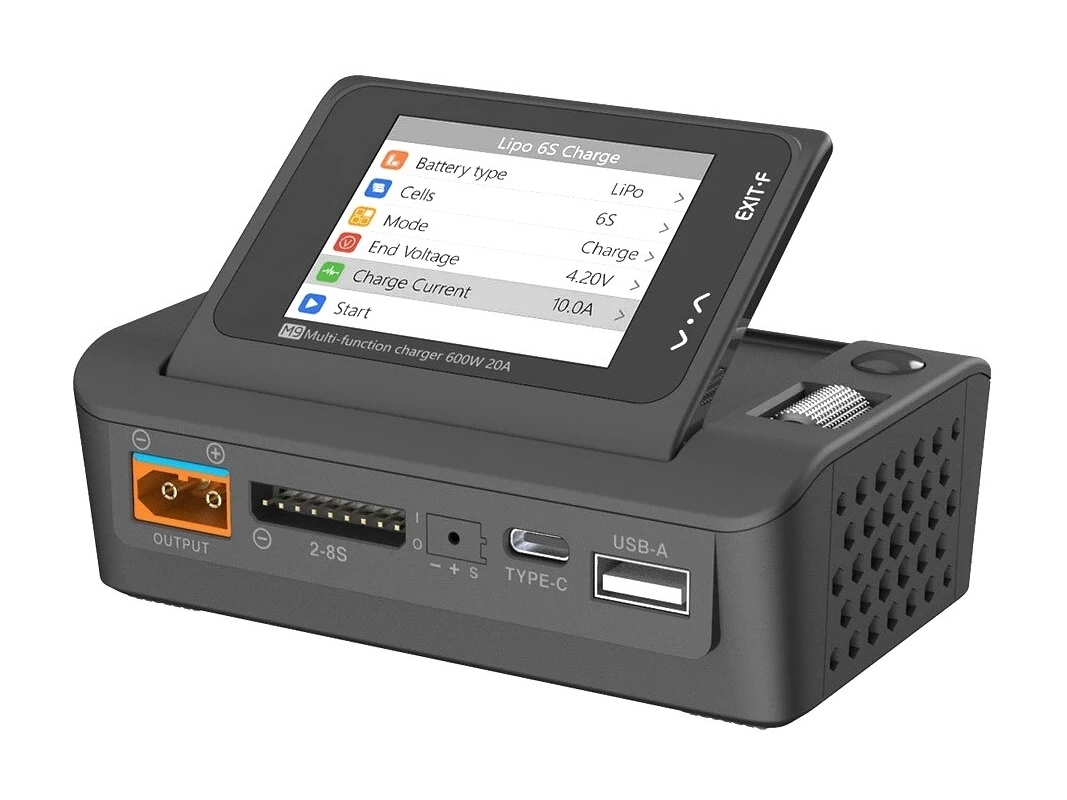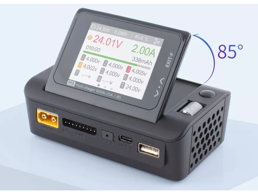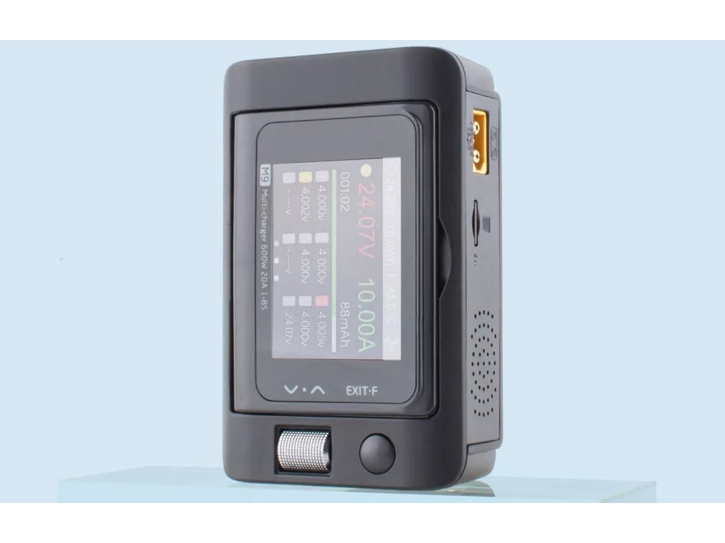 Das ToolkitRC M9 ist ein leistungsstarkes Multifunktions-Ladegerät für den DC-Betrieb, ausgelegt für Akkus bis 8S. Mit bis zu 600W Ladeleistung und 20A Ladestrom bietet es enorme Leistungsreserven bei kompakter Bauform. Das farbige 2.4″ IPS-Display mit weitem Blickwinkel lässt sich von 0° bis 85° neigen und sorgt für optimale Lesbarkeit aus jeder Position.