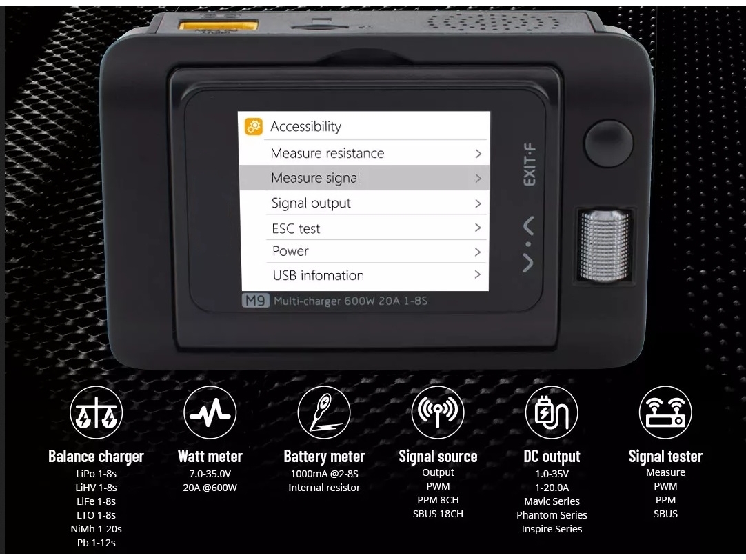 Das M9 bietet zahlreiche Zusatzfunktionen: Neben Balanceladen und Entladen stehen Messfunktionen für Spannung, Innenwiderstand, PWM-, PPM- und SBUS-Signale zur Verfügung. Zudem verfügt das Gerät über Dual-USB-Ausgänge (USB-A und USB-C) mit Fast-Charge-Unterstützung bis 65W. Ein integrierter Lautsprecher ermöglicht Sprachausgabe und individuell anpassbare Alarmtöne.