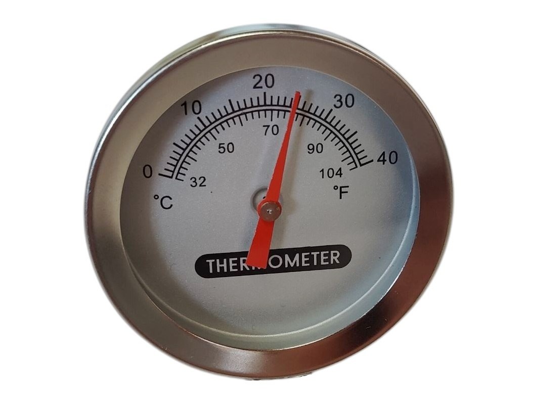 Mechanisches Thermometer aus Edelstahl mit M8-Gewinde zur einfachen Montage an Gärtanks oder Flüssigkeitsbehältern. Ideal zur Kontrolle der Temperatur bei Gärprozessen, Brauanwendungen oder allgemeinen Flüssigkeitsüberwachungen. Die Skala zeigt Temperaturen von 0 bis 40°C (zusätzlich in °F).