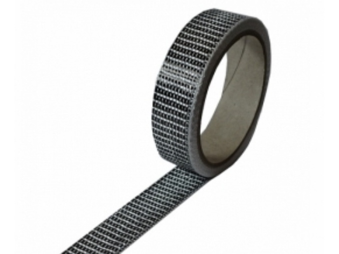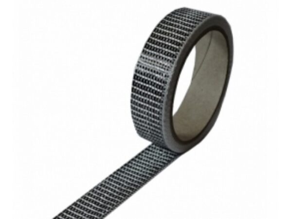 Unidirektionales Carbon-Band. Kohlefaser in Längsrichtung, Querfäden Glas/Polyester, feste Webkante. Besonders hohe Festigkeit in Längsrichtung.
