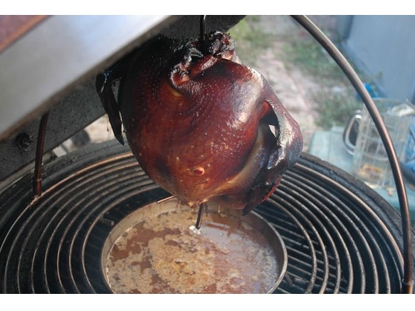 Anwendung: Fleisch vorbereiten und in den aufgeheizten Grill (ca. 120 – 180 GradC) an den Haken hängen. Das Grillgut bleibt einfach hängen, bis es nach Wunsch durchgegart ist. In der Mitte des Gestells finden Sie Platz für ein Auffanggefäss. Dieses kann zum Beispiel, zusätzlich noch mit Bier, Wein oder einer anderen Flüssigkeit gefüllt werden. So bleibt das Grillgut noch saftiger.