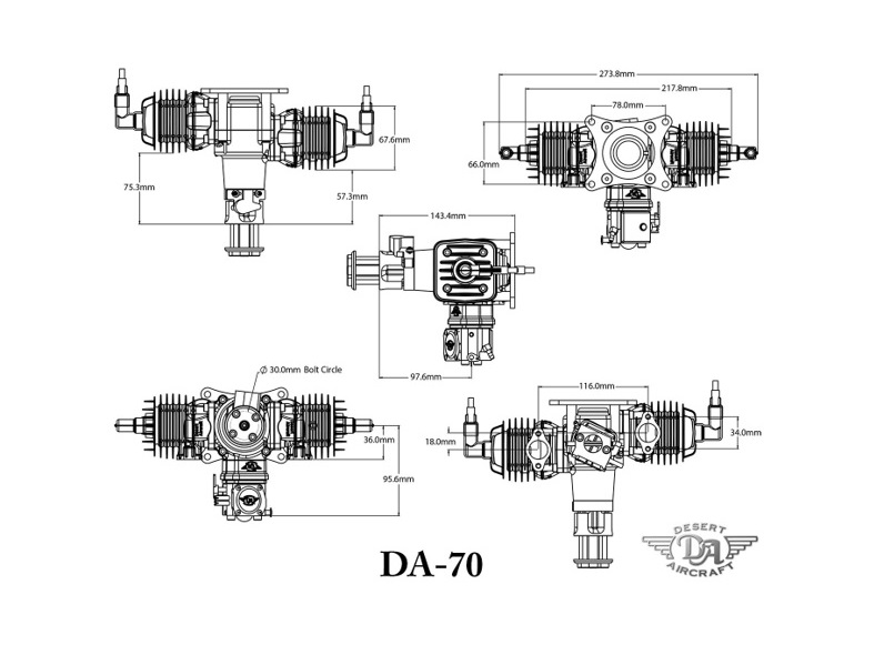 Der DA 70 hat, verglichen zu anderen Boxermotoren seiner Hubraumklasse, ein sagenhaft geringes Leistungsgewicht. So dreht der DA-70 die gleichen Propeller wie der DA-60, aber etwa 400 1/min höher, bei einem Gesamtgewicht inkl. Zündung von nur 1850g!