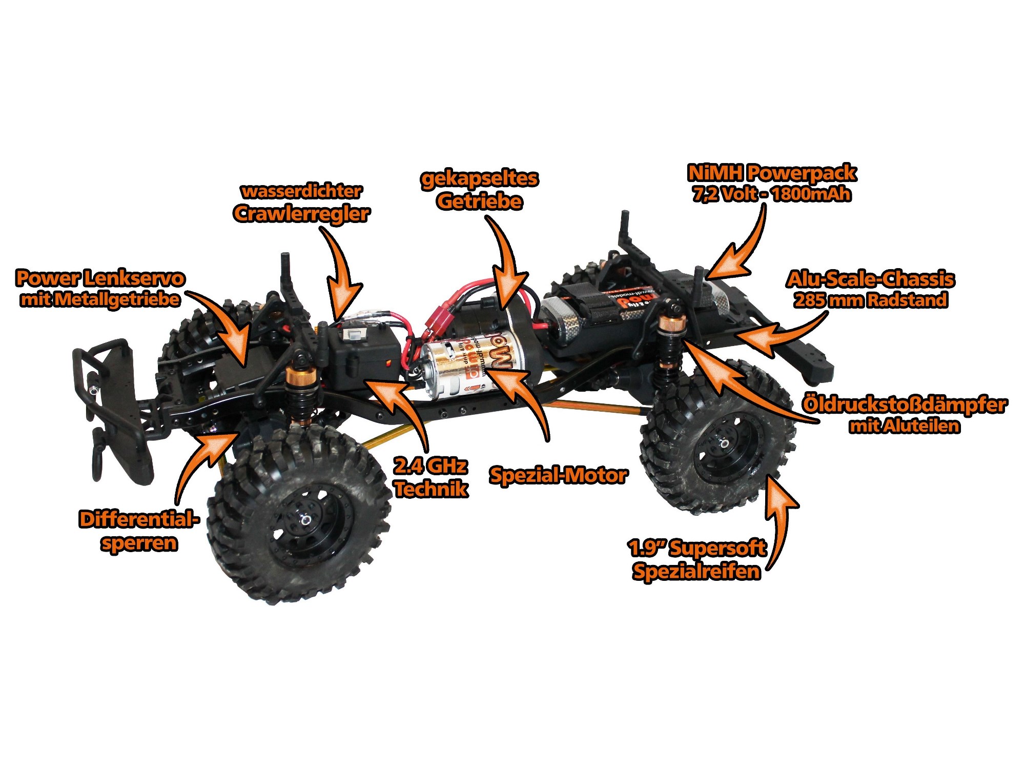 Die Beliebtheit von Crawler-RC-Modellen steigt immer weiter. Der DF-4S Scale-Crawler hat ein Metallrahmenchassis, Differentialsperren, 36 Turn Super-Torque-Crawler Motor und einen speziellen Crawler-Regler. Es sind bereits viele Aluminiumteile verbaut. Die Karosserie ist höhenverstellbar um diese so auf die individuellen Bedürfnisse anzupassen. Extrem Geländegängig, lange Fahrzeit und Supersoftreifen lassen das Crawler-Herz höherschlagen. Eine bereits montierter LED Beleuchtungssatz rundet das Modell ab.