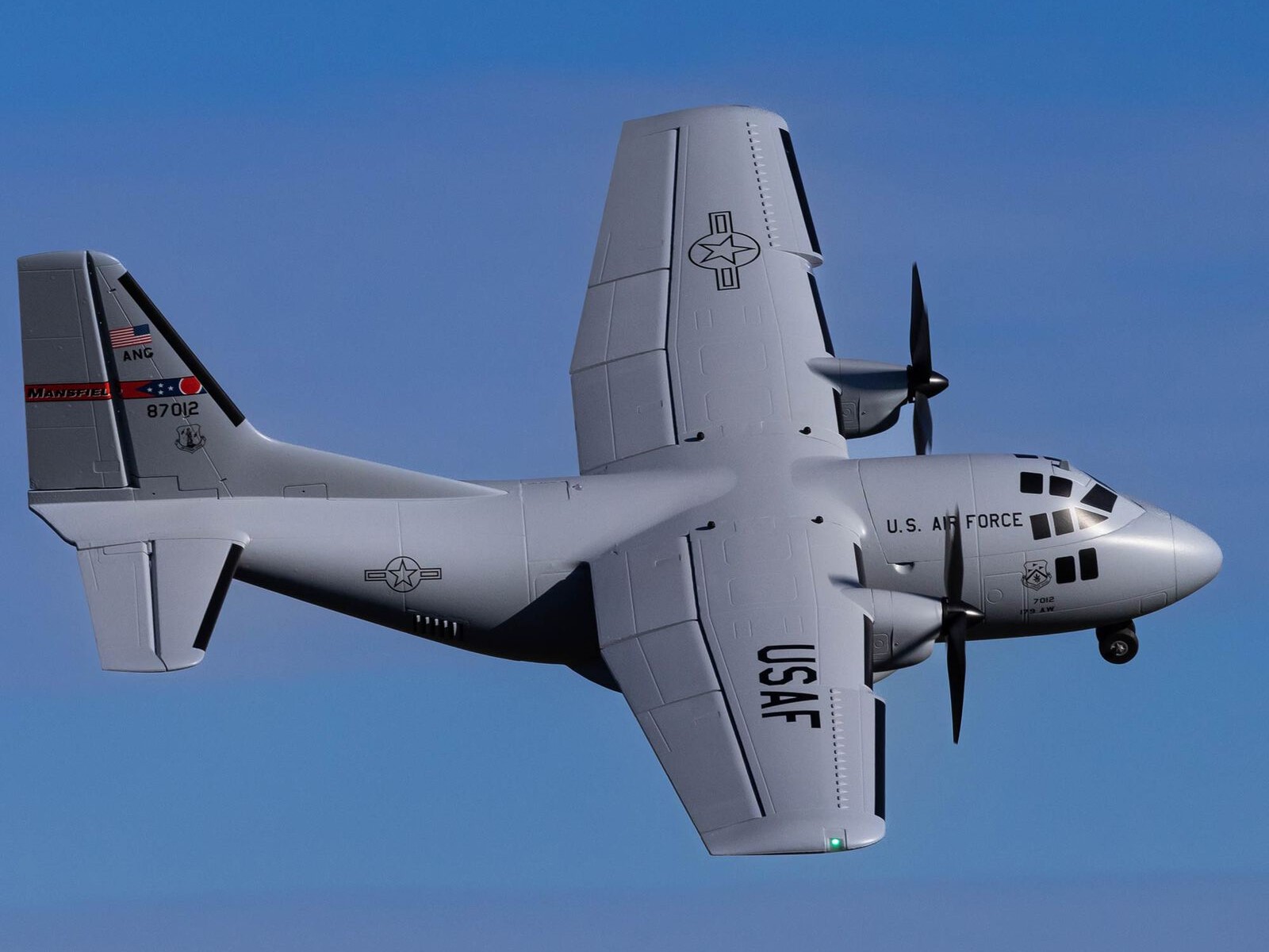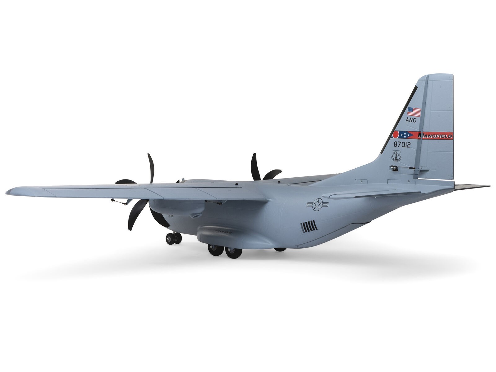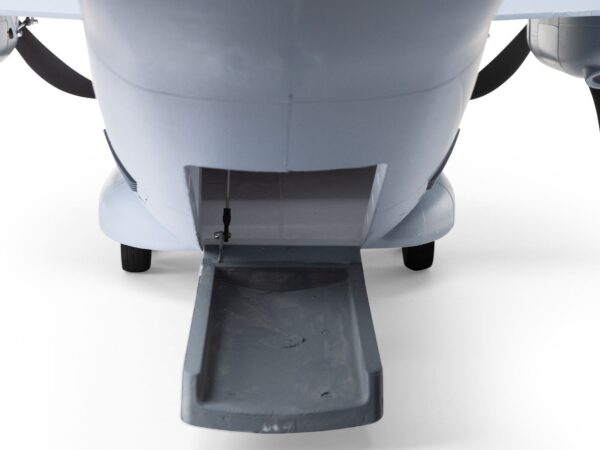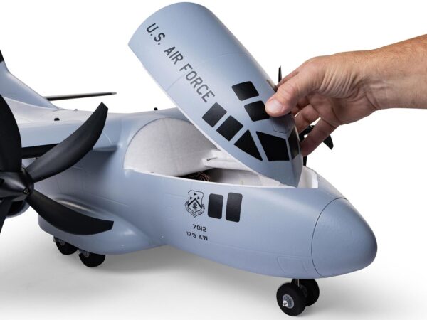 Es sind acht werkseitig installierte Servos verbaut, darunter Servos mit Metallgetriebe auf allen Ruderflächen sowie ein Servo für die funktionale Frachttür, sodass du Nutzlasten in dem grossen Laderaum transportieren und absetzen kannst. Die realistisch aussehende LED-Lande-, Navigations- und ACL-Beleuchtung wird vom Flugakku gespeist, sodass du von morgens bis abends fliegen kannst – von Hart- und Rasenpisten, oder im Schnee mit den mitgelieferten Skiern; oder von grossen Teichen und Seen mit den optionalen Schwimmern (separat erhältlich). Du kannst auch die magnetische Nase abnehmen und eine GoPro oder eine ähnliche Kamera für HD-Luftaufnahmen montieren, oder du installierst eine separate FPV-Kamera an dem grossen oberen Deckel (Kameras/Ausrüstung separat erhältlich). Darüber hinaus kannst du die mitgelieferten Aufkleber zur Personalisierung der vollständig lackierten grauen Oberfläche mit Markierungen der Ohio Air National Guard, Air Force, Army, Coast Guard, Marines, Navy und anderen verwenden! Das Ergebnis von all dem ist die bisher leistungsfähigste, vielseitigste und unterhaltsamste Zweimot für ein breites Spektrum von fortgeschrittenen bis erfahrenen Piloten, die sich für vorbildgetreues oder sportliches Fliegen und sogar aggressiven 3D-Kunstflug interessieren.