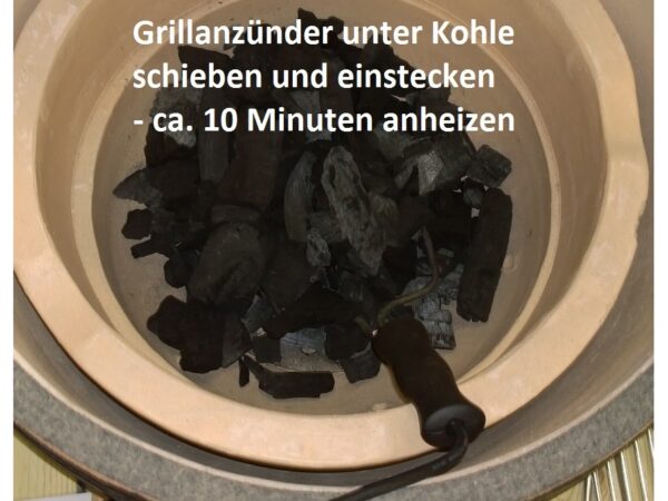 ACHTUNG: Lassen Sie den Elektro-Anzünder nicht zu lange im Grill, da sonst der Kunststoffgriff Schaden nehmen kann.