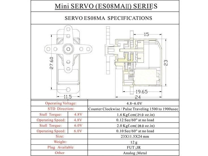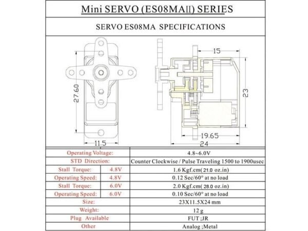 EMax Mini Analog Servo ES08MA II mit Metallgetriebe Kraft 2.0kg/6V