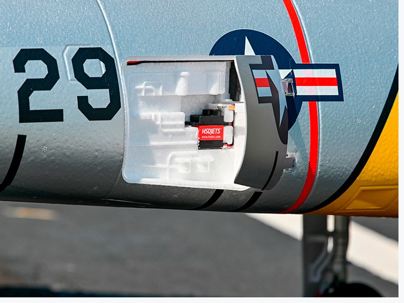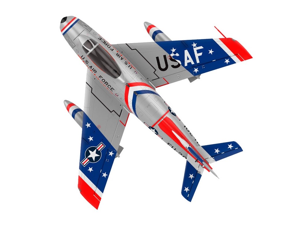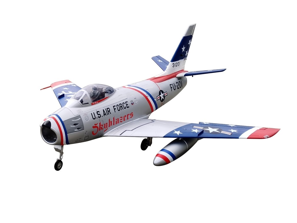 Das Modell aus hochfestem EPO-Foam ist weitgehend vorgefertigt und innert kurzer Zeit bereits flugfertig. Die F-86 Sabre verfügt über funktionsfähige Landeklappen, ein gefedertes, elektrisches Aluminium-Einziehfahrwerk mit elektrischer Bremse und einer Scale-Beleuchtung. Alle Komponenten wie das gefederte Fahrwerk, die 120mm S-EDF Impeller-Einheit mit Motor, der Regler und die Servos sind bereits eingebaut.