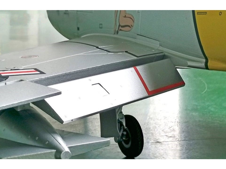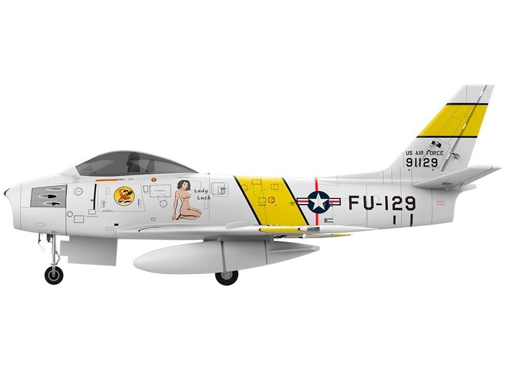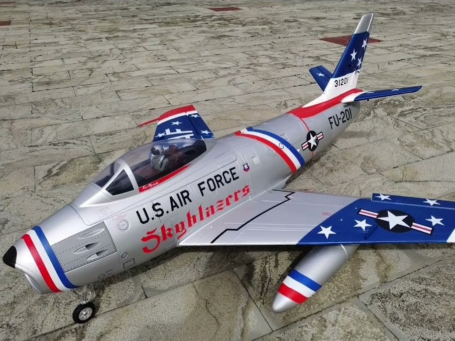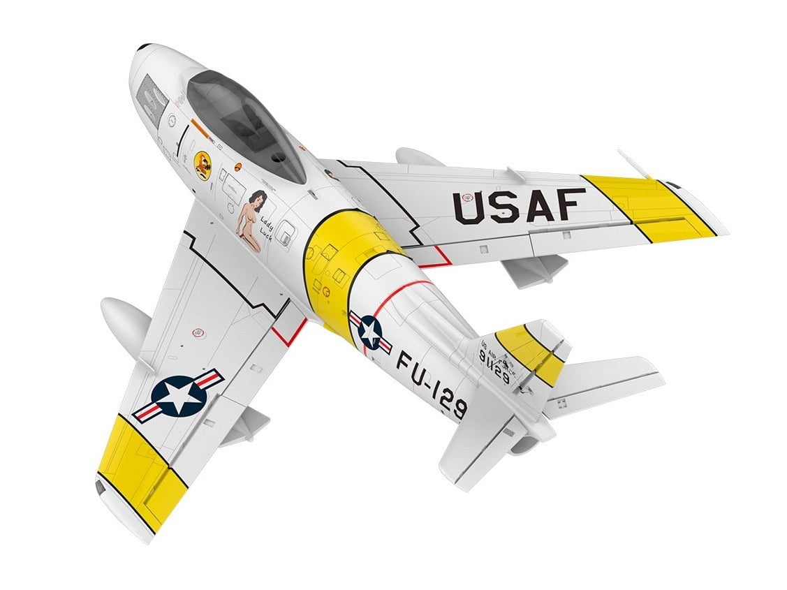 Das Modell aus hochfestem EPO-Foam, grösszügig verstärkt mit GFK und CFK ist weitgehend vorgefertigt und innert kurzer Zeit bereits flugfertig. Die F-86 Sabre verfügt über funktionsfähige Landeklappen, ein gefedertes, elektrisches Aluminium-Einziehfahrwerk mit elektrischer Bremse und einer Scale-Beleuchtung. Alle Komponenten wie das gefederte Fahrwerk, Tanks, Schubrohr, Digital-Servos, u.s.w, sind bereits eingebaut. Zum Betrieb fehlt nur noch eine Turbine mit ca. 8-12kg Schub, sowie Sender/Empfänger und Empfänger-Akkus.