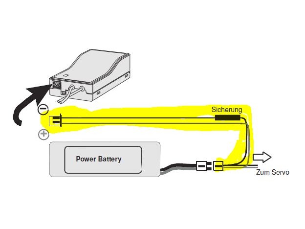 Das Kabel wird an den Reglereingang mit einer zusätzlichen Sicherung eingelötet und am Empfänger eingesteckt.