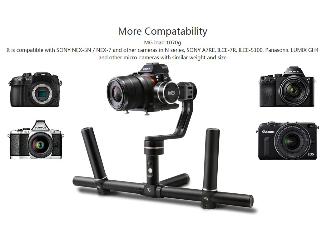 Das neue MG-Gimbal für Digital-Kameras ist ein wahres Multitalent. Es bietet Platz für viele beliebte Kameras und lässt sich auf verschiedene Arten einsetzen.