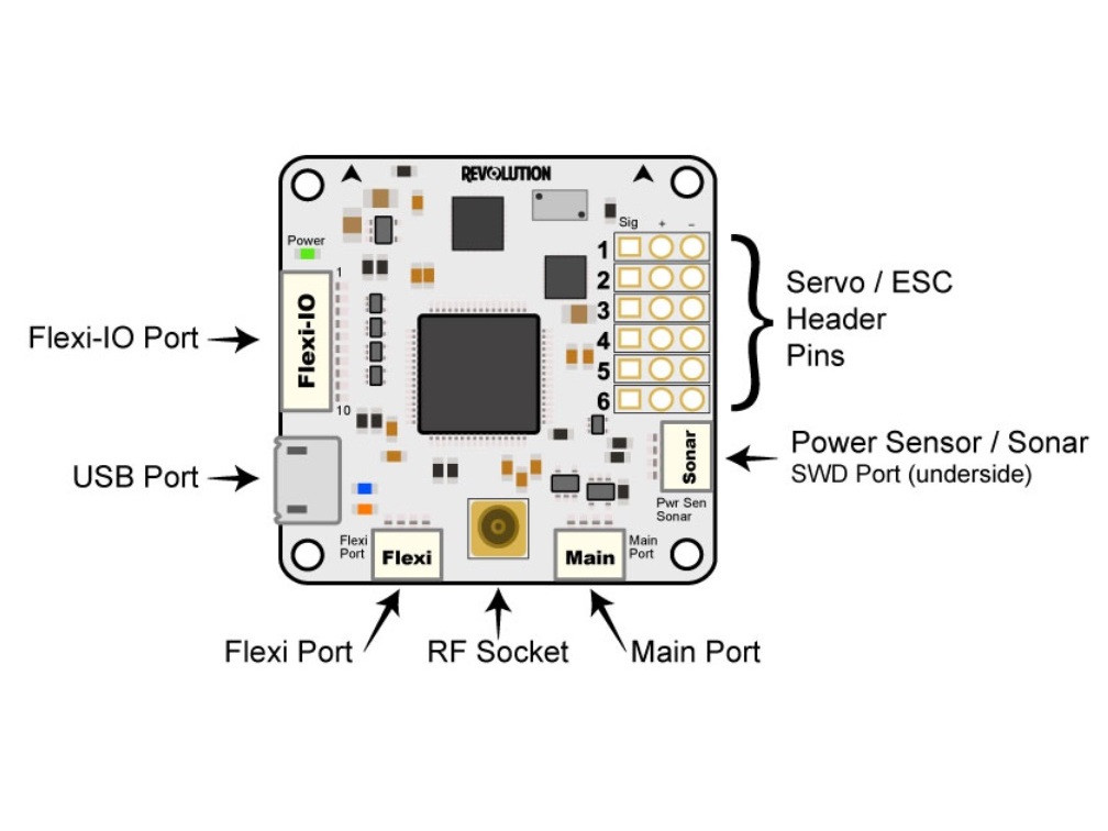MainPort: JST-SH 4-pin. This is a serial USART whose baud rate can be adjusted through the GCS. Optionally, Futaba S.Bus receiver, Spek-trum/JR satellite receiver or GPS can be mapped to the MainPort. Default configuration is Telemetry for connecting an RF modem.