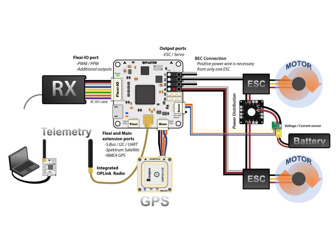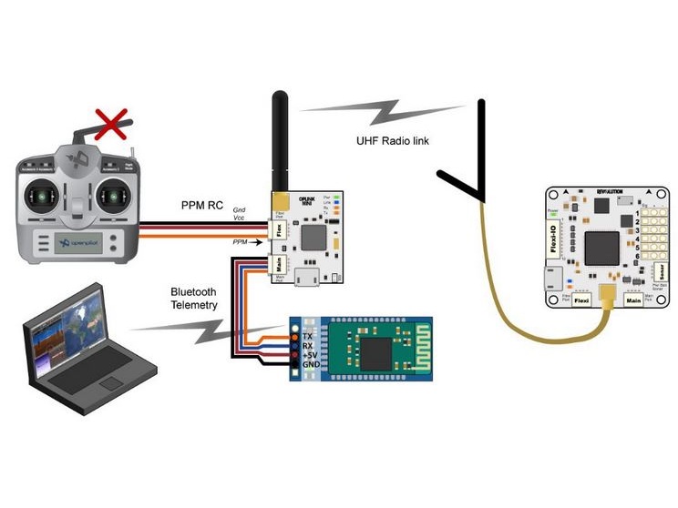 – You will need two OPLink radios to establish a connection between the vehicle and ground station. Note that the Revolution board has an OPLink built into the flight controller. The same firmware version must be running in Revo and OPLM devices (i.e. if you upgrade one board, you will need to upgrade all others that are ‘bound’ together).