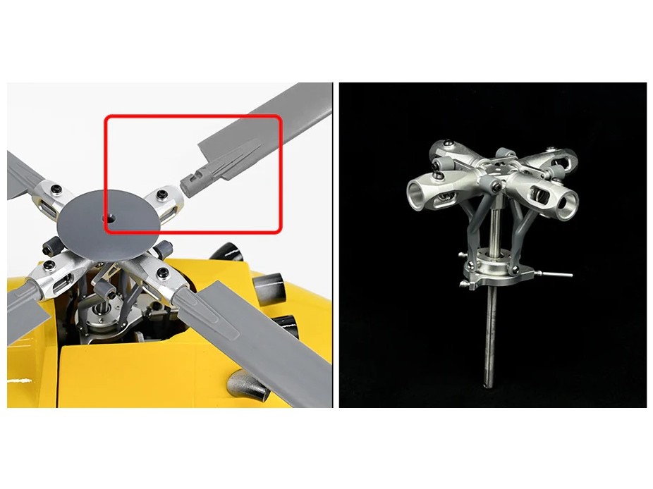 Ein besonderes Highlight ist der neu entwickelte CNC-gefräste Vierblatt-Rotorkopf mit einer Schnellverschlussmechanik, das einen schnellen und einfachen Wechsel der Rotorblätter ermöglicht. Die verwendeten hochleistungsfähigen Rotorblätter mit NACA 8-H-12-Profil sorgen für eine verbesserte Aerodynamik, hohe Auftriebseffizienz und optimierte Flugeigenschaften, besonders bei niedrigen Geschwindigkeiten.