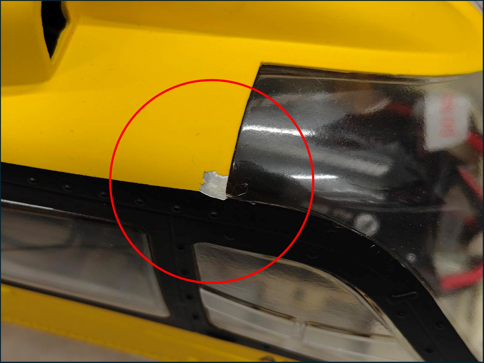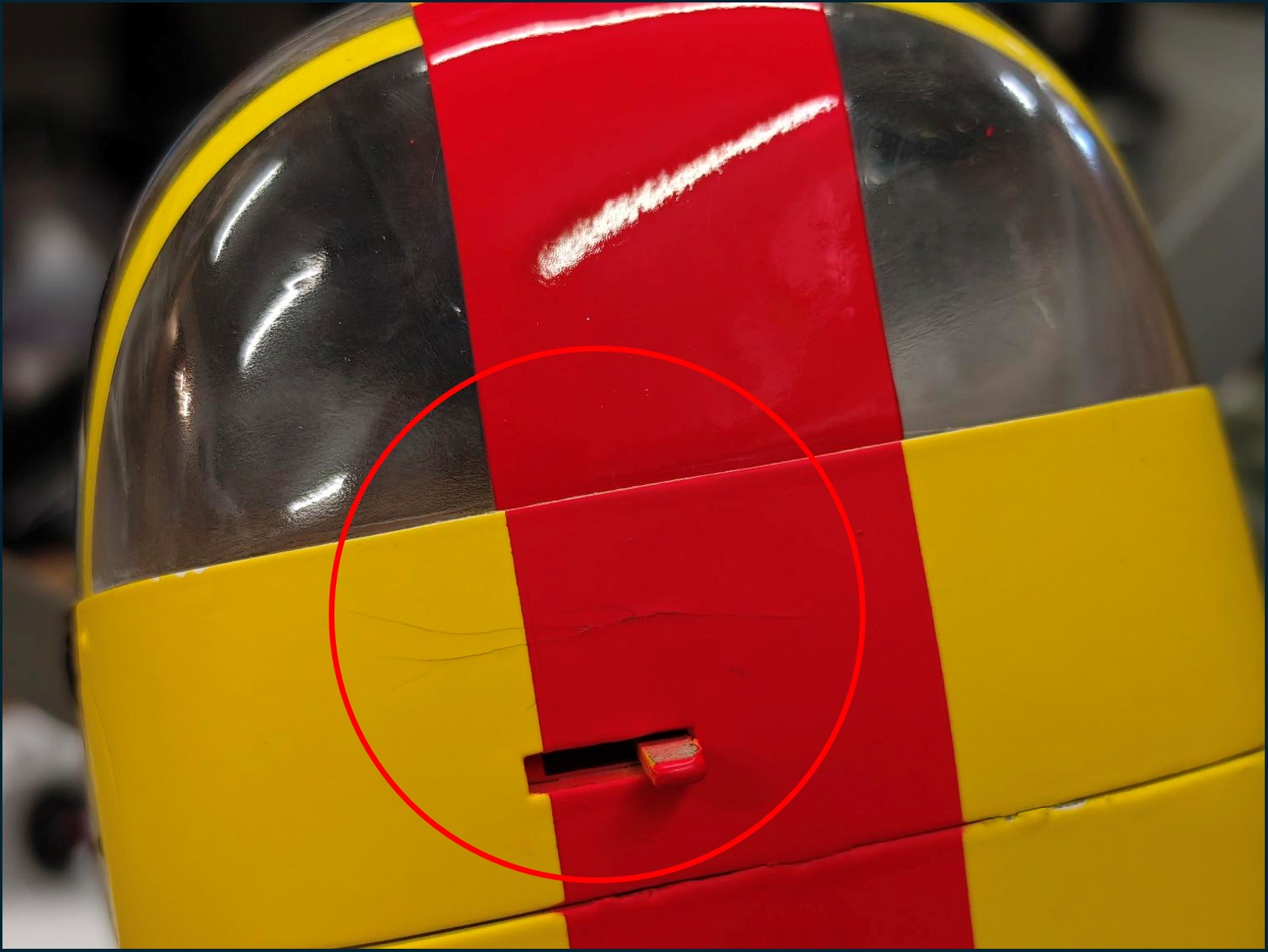 An der Kabinenhaube sowie am Rumpf ist jeweils ein kleiner Farbplatzer und unten an der Kabinenhaube hat es leichte Risse. Ansonsten ist der Hubschrauber in einwandfreiem Zustand und funktioniert einwandfrei.