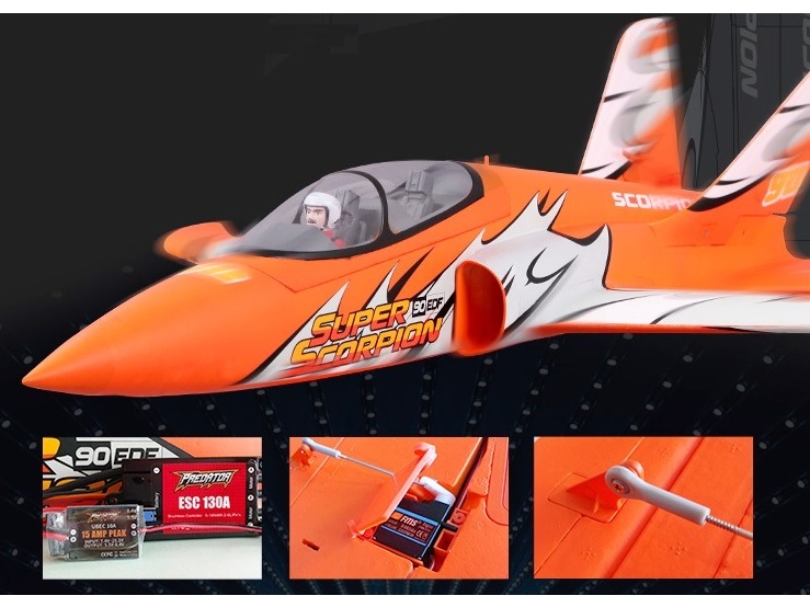 Der 90mm EDF-Jet wird Sie begeistern. Das Modell verfügt über eine geniale Optik, Landeklappen und ein elektrisches, gefedertes Einziehfahrwerk. Entwickelt wurde die Super Scorpion in Zusammenarbeit mit dem Aviation Design Team in Frankreich. Angetrieben wird der Jet durch einen starken 1900KV Brushless-Motor in Kombination mit einem 130A-Brushless-Regler und einem 12-Blatt – 90mm Impeller.