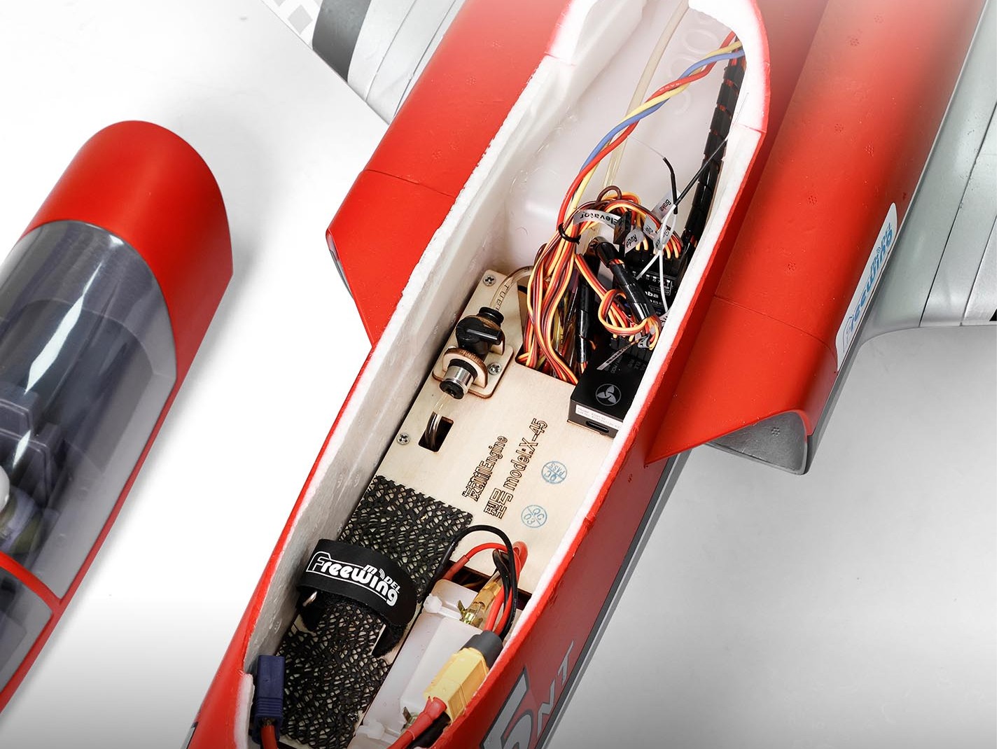 Die Konstruktion besteht aus hochverdichtetem EPO-Schaum mit verstärkten Bereichen aus ABS und CFK. Die Tragflächen sind aus 20x EPO-Material, der Rumpf und die Leitwerke aus 35x EPO-Material gefertigt – für maximale Festigkeit bei gleichzeitig geringem Gewicht. Der Zeus 45NT wird ab Werk mit vormontierten Komponenten geliefert, inklusive Tanksystem, elektronischem Bremssystem (ABS/manuell umschaltbar), UBEC-Stromversorgung, 6-Achs-Gyro, LED-Beleuchtung und vorbereitetem Turbinen-Einbau.