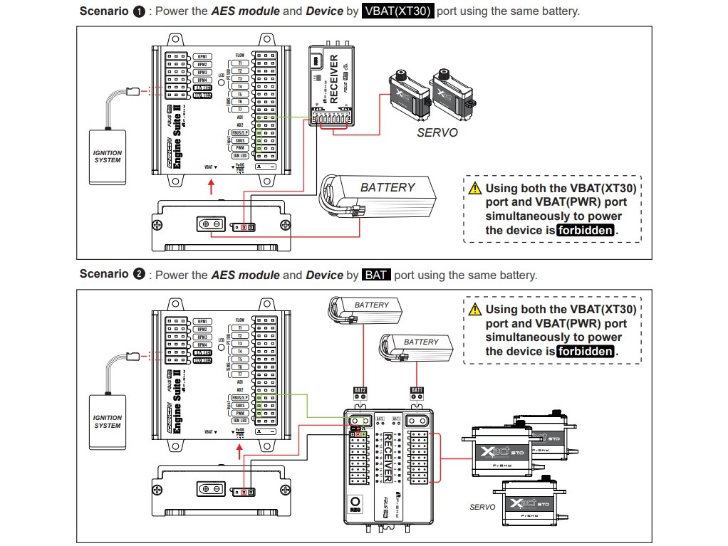 Über den VBAT (XT30) Stromanschluss kann eine einzige Batterie alle angeschlossenen Geräte mit Strom versorgen, wodurch der Aufwand für eine separate Stromquelle für die Zündsteuerung entfällt. Das AES-Modul setzt zudem auf eine Sicherheitslösung, um mögliche Störungen zwischen der Zündung und dem Empfänger zu verhindern.