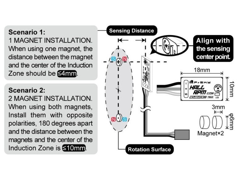 Der FrSky Hall RPM ADV ist ein Hall-basiertes Drehzahlerfassungssystem, das über einen oder zwei Magnete die Rotationsgeschwindigkeit zuverlässig detektiert. Durch die Hall-Technologie eignet sich dieser Sensor besonders für Elektromotoren, bei denen drehende Komponenten oder Wellen direkt per Magnetabnahme überwacht werden können. Der Sensor kann direkt über den S.Port- oder FBUS-Anschluss Telemetriedaten an kompatible Sender übermitteln oder im PWM-Modus das Signal an Geräte mit RPM-Auswertung weitergeben.