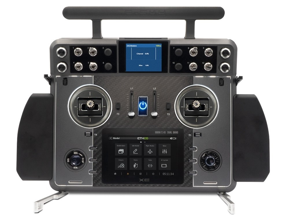 Der Tandem XE ist mit zwei Bildschirmen ausgestattet. Der 4.3 Zoll grosse Hauptbildschirm verfügt über einen Farb-Touchscreen und ist für die Bedienung von ETHOS, respektive für die Modellkonfiguration vorgesehen. Der zweite, kleinere 2.4 Zoll Farbbildschirm befindet sich auf der Oberseite des Senders. Dieses Display kann individuell konfiguriert werden und zeigt dem Nutzer die gewünschten Werte an.