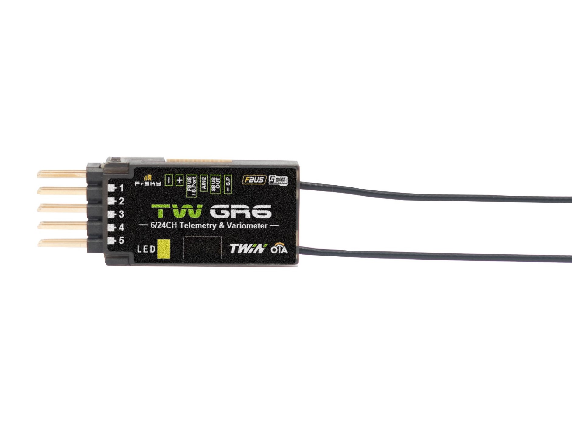 Der Empfänger ist mit zwei 2.4G Antennen ausgestattet. Weiter verfügt er über einen SBUS-Ausgang und sechs PWM-Kanäle. Die Telemetriefunktionen werden über FBUS / S.Port unterstützt. Darüber hinaus unterstützt der TW-Empfänger auch den 4ms-Race-Mode mit extrem niedriger Latenzzeit.