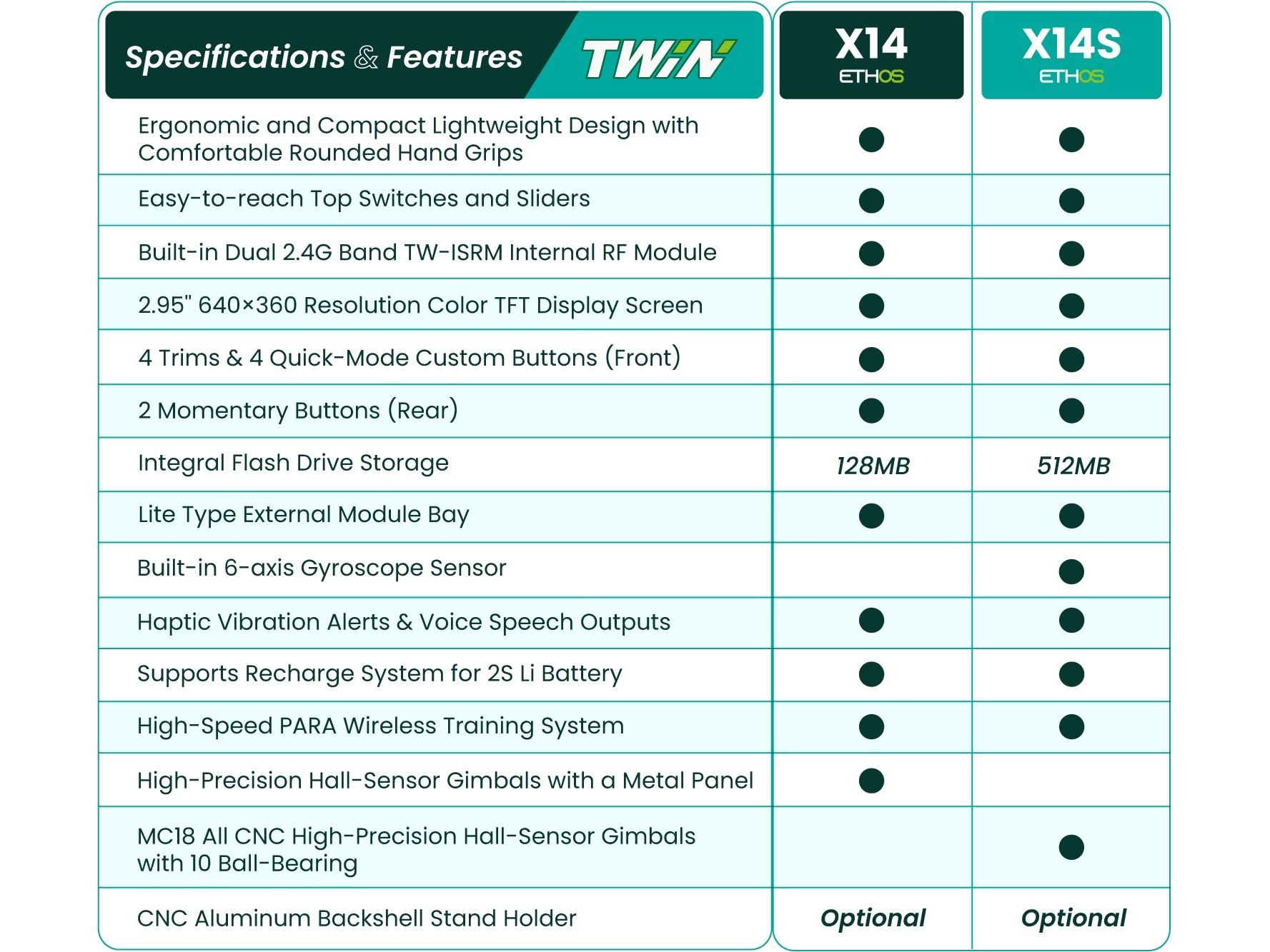 Ausgestattet mit zwei internen 2.4G HF-Antennen bietet die TWIN X14S eine grosse multidirektionale Abdeckung für die Signalübertragung. Durch die Nutzung dieser Eigenschaften zusammen mit den Aussenantennen-Montagerahmen bietet das Twin-System eine geringe Latenzzeit, höhere Zuverlässigkeit und schnellere Datenraten. Zusätzlich zum TW-Modus unterstützt die TWIN X14S auch die Modi ACCST D16 und ACCESS. Dies bietet dem Benutzer eine breite Palette kompatibler Empfängeroptionen.