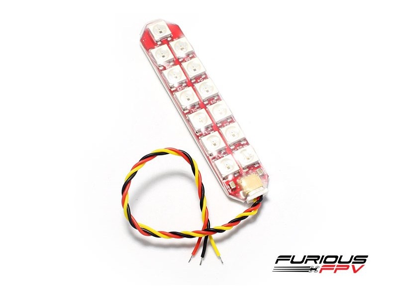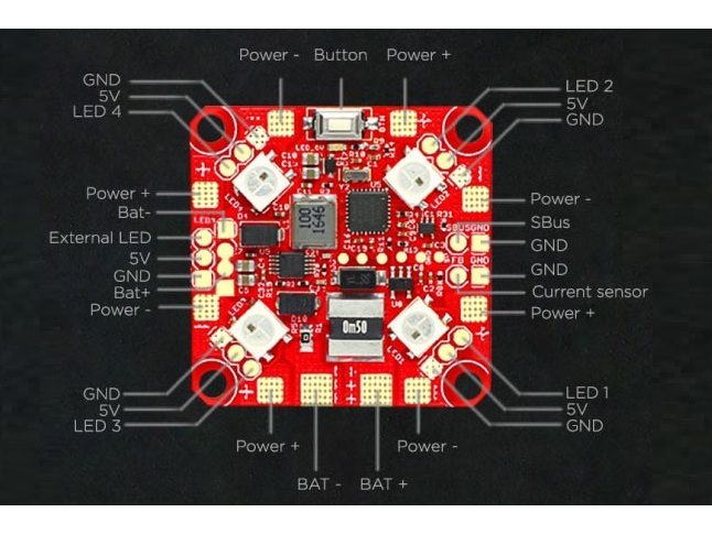 Das Furious FPV Lightning PDB ist in erster Linie ein PDB welches die Regler und das FPV Equipment wie gewohnt mit Power versortgt. Zusätzlich bietet das Lighning PDB eine komplette LED Steuerung – 4x LED-Streifen a 13 RGB-LEDs sind im Lieferumfang enthalten. Die LEDs lassen sich durch den integrierten Button auf dem PDB oder durch ein SBUS Signal über die Fernsteuerung, sowie durch den FC steuern. Das Löt-Pad Layout garantiert trotz der vielen Features einen sauberen Aufbau.