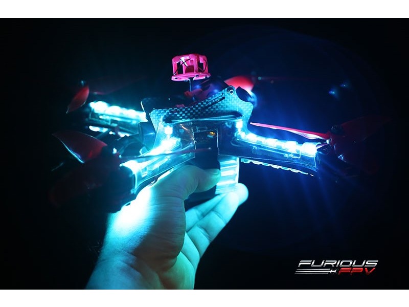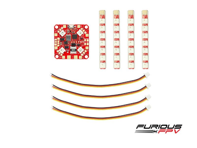 Das Furious FPV Lightning PDB ist in erster Linie ein PDB welches die Regler und das FPV Equipment wie gewohnt mit Power versortgt. Zusätzlich bietet das Lighning PDB eine komplette LED Steuerung – 4x LED-Streifen a 7 RGB-LEDs sind im Lieferumfang enthalten. Die LEDs lassen sich durch den integrierten Button auf dem PDB oder durch ein SBUS Signal über die Fernsteuerung, sowie durch den FC steuern. Das Löt-Pad Layout garantiert trotz der vielen Features einen sauberen Aufbau.
