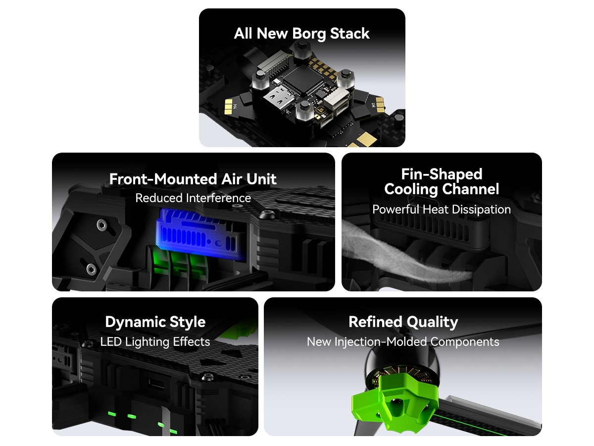Die Evoque-Serie wurde in dieser Version mit sechs wesentlichen Upgrades ausgestattet: Ein neuentwickeltes Kühlsystem im Lamellen-Design sorgt für optimale Hitzeableitung und stabile Performance. Der überarbeitete Borg-Stack verfügt über einen integrierten Anti-Funken-Filter sowie eine duale, unabhängige BEC-Stromversorgung für maximale Ausfallsicherheit. Zusammen mit den leistungsstarken XING2 2809 Motoren und dem Dual-Antennen-System für erhöhte Signalstabilität setzt dieser BNF-Copter neue Massstäbe in Sachen Reichweite und Zuverlässigkeit.