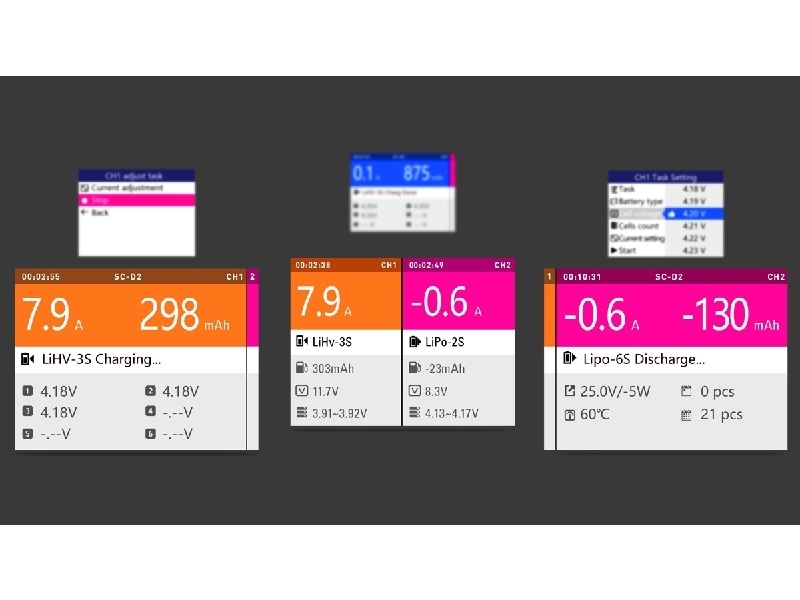 Dank integriertem Netzteil kann dieses Ladegerät direkt an die 230V Steckdose angeschlossen werden. Mit diesem Ladegerät können zwei unterschiedliche Akkus gleichzeitig geladen werden. In Schritten von 0.1A lässt sich der Ladestrom bis zu 12A bei max. 200W Ladeleistung wählen. Total 200 Watt an beiden Ausgängen zusammen, darf nicht überschritten werden. Der Entladestrom ist bei max. 5W Entladeleistung von 0.1A bis 3A einstellbar. Ein integrierter Balancer gleicht die einzelnen Zellenspannungen von Lithium-Akkus mit bis zu 1A zueinander an.