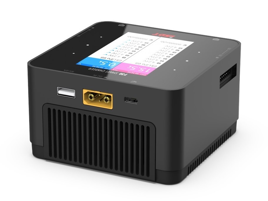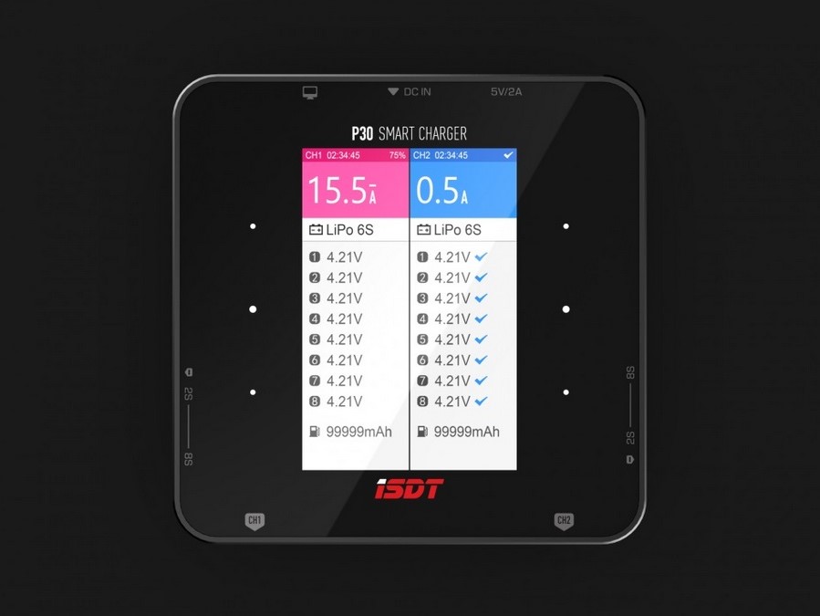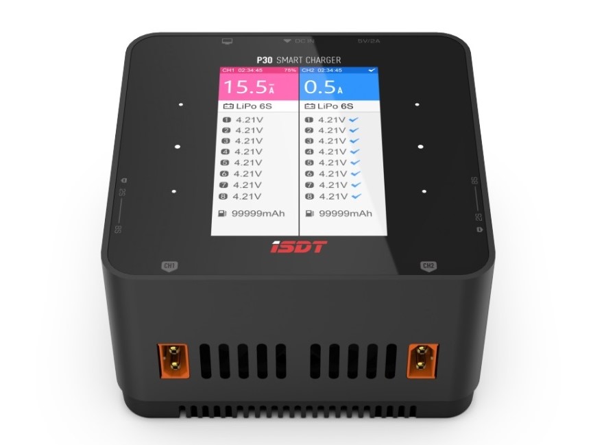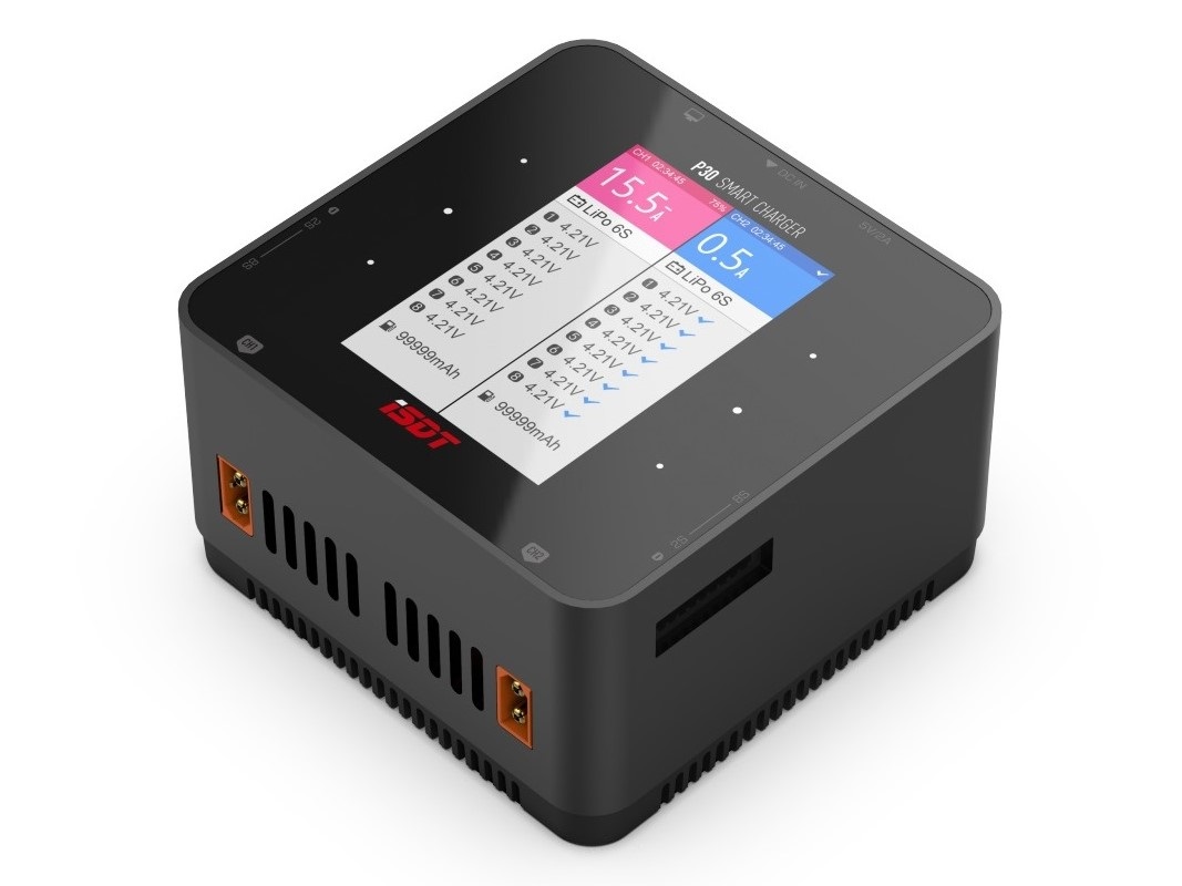 Der iSDT Lader P30 verfügt über zwei Ladeausgänge – die je, bis zu 8S LiPo Akkus mit bis zu 30A laden können. Zur Verfügung stehen 1000 Watt Leistung pro Ausgang, im Parallel-Ladevorgang werden beide Ausgänge zusammen geschaltet, was eine Leistung von bis zu 1500 Watt – bei 25 Volt Eingangsspannung möglich macht. Das Gehäuse ist robust und hochwertig aus Aluminium gefertigt. Das neue scOS 2.0 bietet eine verbesserte Systemstabilität und neue Funktionen wie den Dark Mode, einen DC Power Mode und einen Modus, um defekte Akkus auf 0 Volt zu entladen. Ein grosses 3.5 Zoll Display bietet einen guten Kontrast, was eine gute Lesbarkeit auch bei Sonneneinstrahlung bedeutet. Die einfache und intuitive Bedienung erfolgt mittels drei Tasten. Weiter verfügt das P30 über eine Bluetooth Schnittstelle. Mit der passenden App für iOS oder Android sind alle wichtigen Funktionen direkt auf dem Smartphone sichtbar.