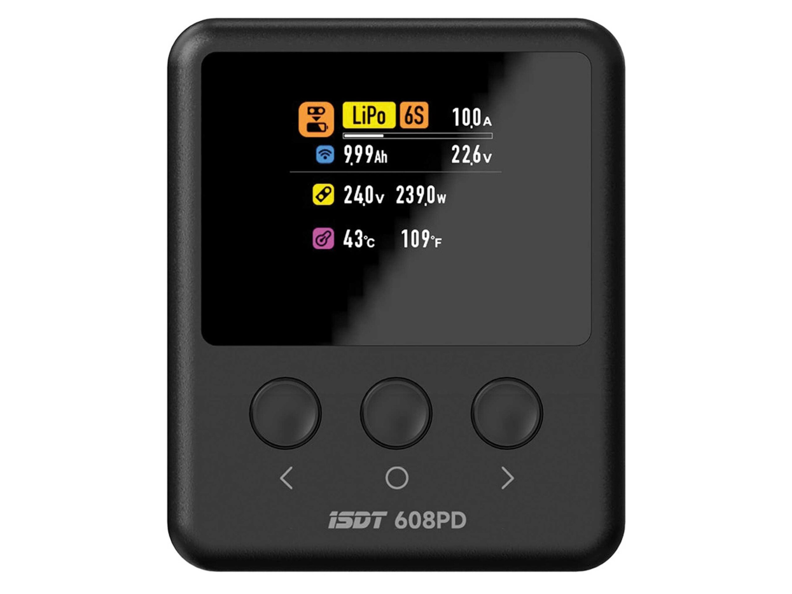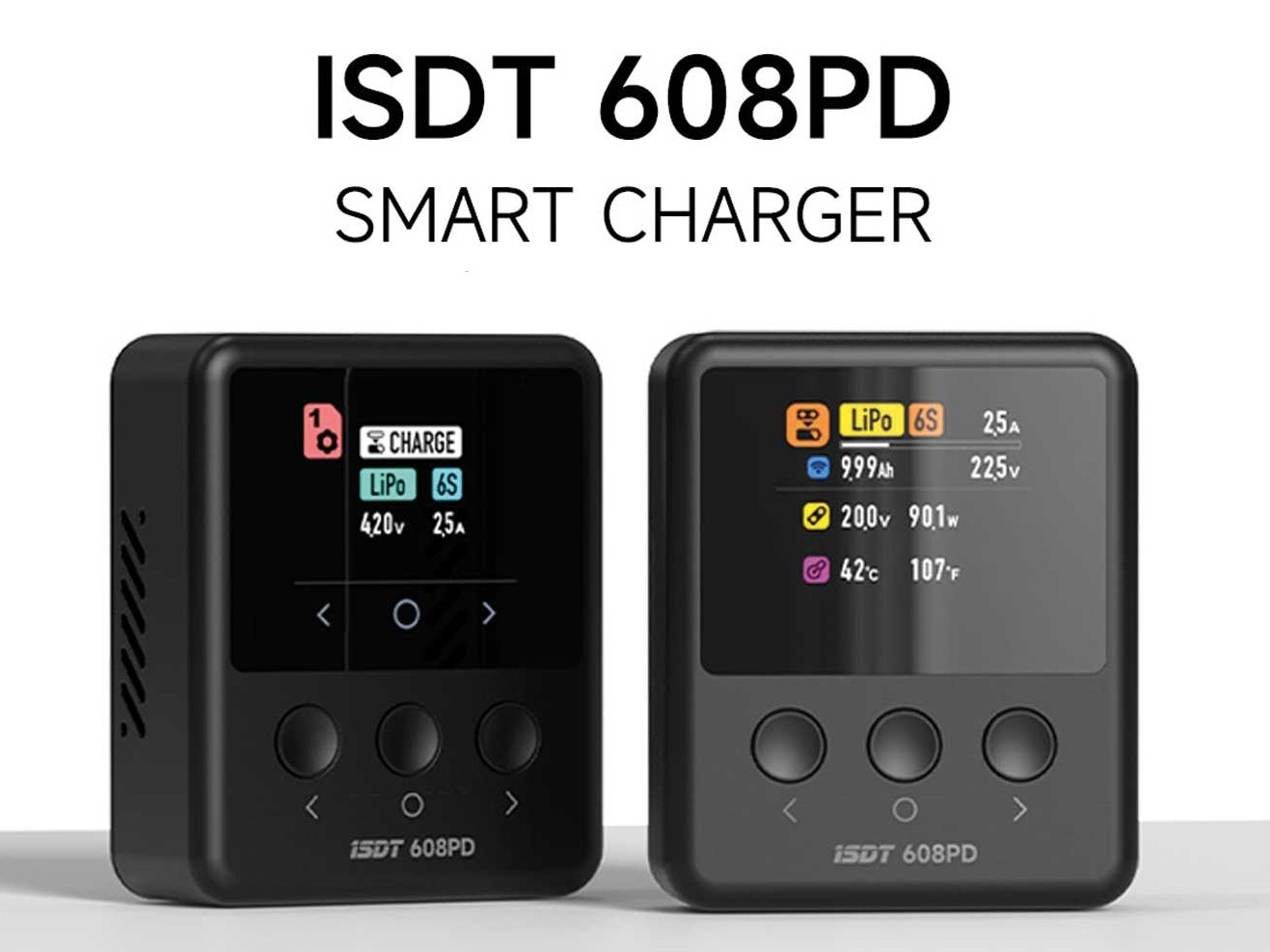 Das iSDT 608DP ist ein kompaktes, intelligentes Hochleistungs-Ladegerät der neuesten Generation. Trotz seiner geringen Abmessungen liefert es eine DC-Ladeleistung von bis zu 240 W (10 A) sowie 140 W über USB-C – ideal für den mobilen Einsatz oder das Laden auf dem Flugplatz. Der integrierte 2.4-Zoll-IPS-Bildschirm bietet eine klare Anzeige aller Ladeparameter bei minimalem Stromverbrauch.