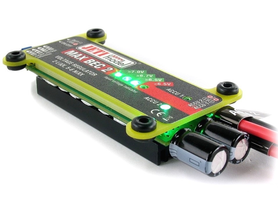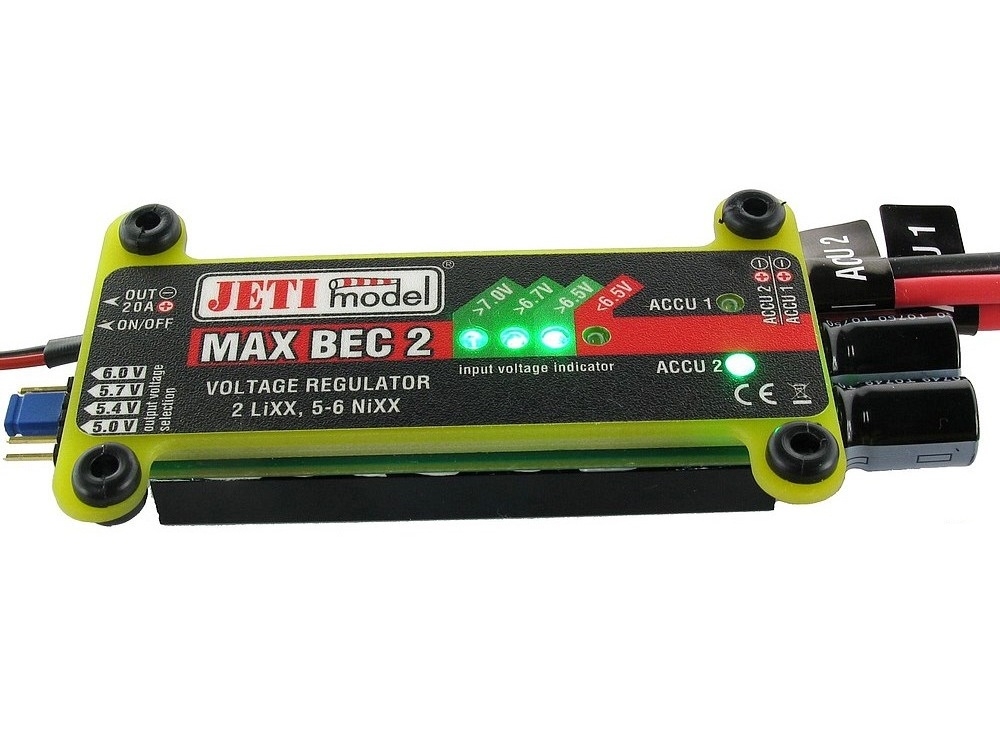 Das MAX BEC 2 wurde entwickelt, um den Empfänger und Servos im Modell zu versorgen. MAX BEC 2 besitzt einen linearen Spannungsstabilisator mit einer einstellbaren Ausgangsspannung. 5.0, 5.4, 5.7 oder 6.0 Volt: Die Ausgangsspannung wird über einen Jumper eingestellt . MAX BEC 2 kann mit NiXX-und Li-XX Zellen versorgt werden. MAX BEC gibt auch einen Hinweis auf verbrauchten Kapazität der Akkus mit Hilfe von vier LEDs.