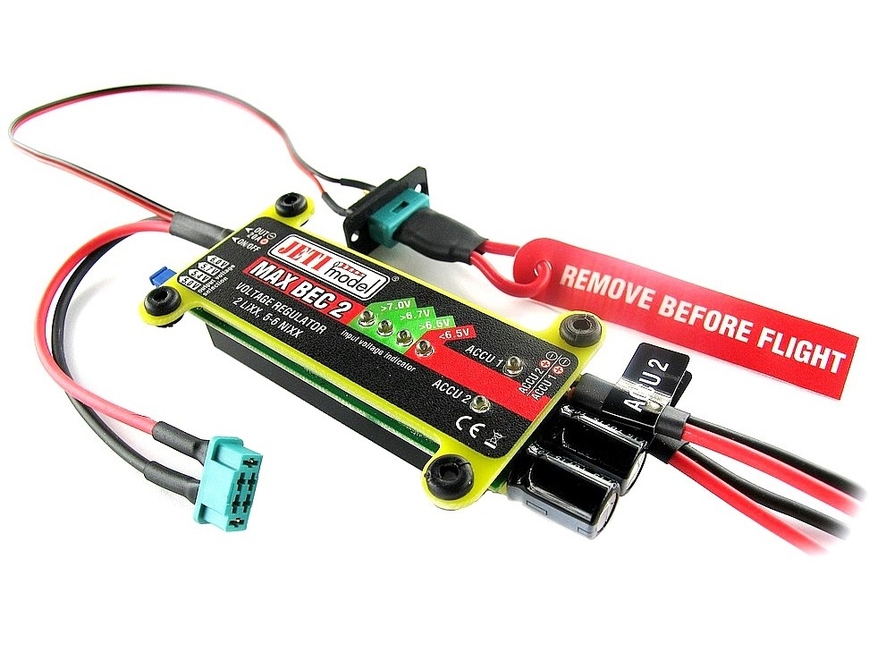 Ein integrierter Teil des MAX BEC 2 ist ein elektronischer Schalter, der eine hocheffiziente Art von MOSFET-Transistor verwendet. Die wichtigsten Vorteile des MAX BEC 2 sind eine hohe Spannungsfestigkeit (bis 12 Zellen NiXX) und niedrigem Strom in dem ausgeschalteten Zustand 170uA. Die analoge Spannungsstabilisierung sorgt dafür, dass es nicht zu Funkstörungen kommt.