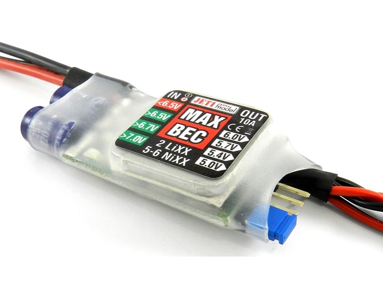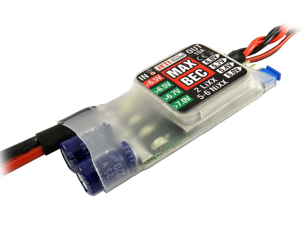Linearregler MAX BEC ist ein anspruchsvolles Instrument zur Regulierung von Spannungen in Modellen, die einen Empfänger und Servos haben, die durch 2 LiXX Zellen oder 5-6 NiXX Zellen angetrieben werden. Die Servospannung ist während des gesamten Fluges konstant, daraus resultieren gleichmässige Bewegungen der Servos.