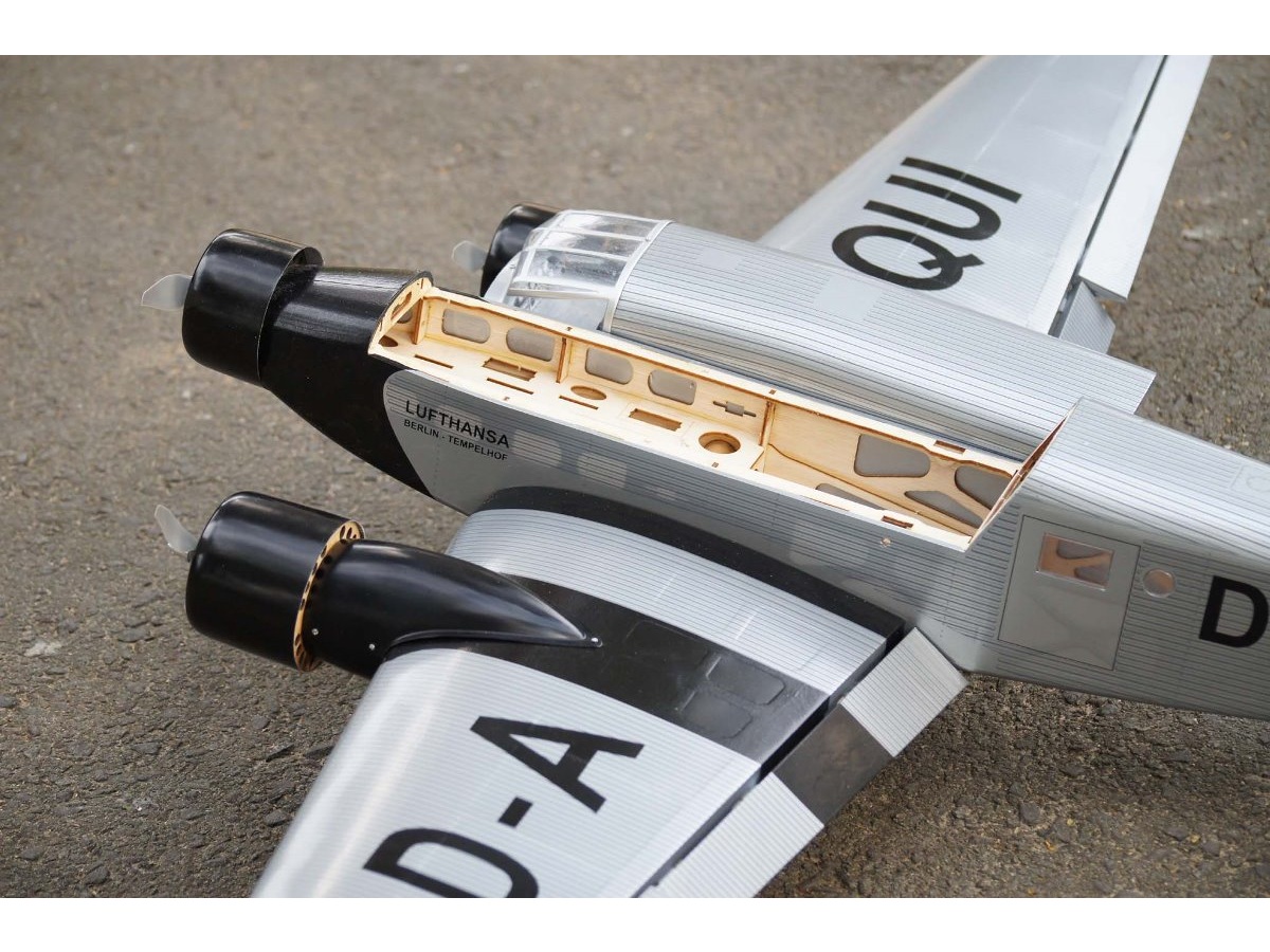 Die Junkers JU-52 wird auch liebevoll “Tante Ju” genannt. Die ursprünglich als Frachtflugzeug konstruierte JU, wurde später überwiegend als Verkehrsflugzeug eingesetzt. Flugzeugtypisch sind drei Antriebsmotoren und eine Aussenhaut aus Wellblech. Unser Modell der Junker ist in leichter Holzbauweise gefertigt und mit hochdetaillierter Folie bespannt.