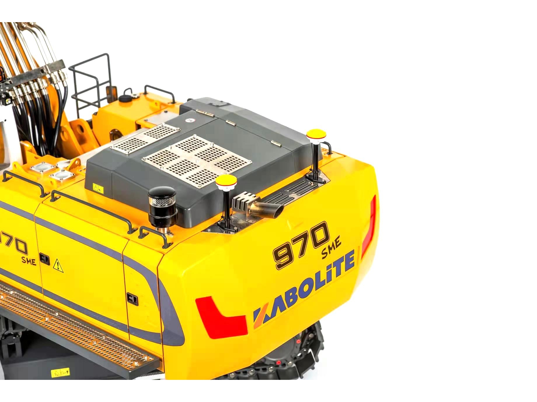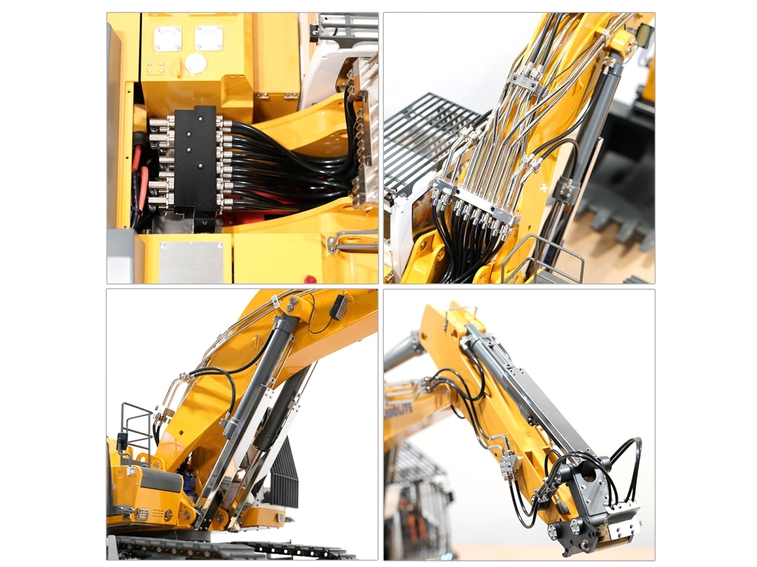 Dieser Super Scale Nachbau eines 70 Tonnen Baggers steht dem original in nichts nach.Alle Funktionen, alle Anbauteile und selbst der Cockpit Ausbau sind bis in kleinste Detail dem Original nachempfunden. In der Scale Kanzel ist sogar ein LCD Display untergebracht, welches Echtzeit Telemetriedaten wie Akkustand, Temperatur, Laufzeit und den aktuellen Hydraulikdruck anzeigt. Der Arbeitsdruck des Hydrauliksystems beträgt dabei je nach Arbeitszustand bis zu ca. 33 bar. Bereits in der Herstellungsfabrik wurde der gesamte Hydraulik Kreislauf mit ca. 60 bar Druck auf Dichtigkeit geprüft.
