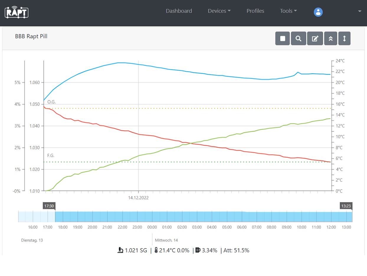 Durch die Datenübertragung via WLAN oder Bluetooth in das RAPT-Portal / App oder Plattform – erhält man mit der RAPT Pill stets den Überblick über den Fortschritt der Gärung des Bieres. Dadurch kann leichter abgeschätzt werden, wann das Bier abgefüllt werden kann oder ob der perfekte Zeitpunkt zum Hopfenstopfen erreicht ist.