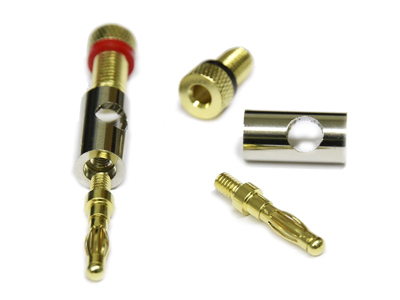 LS-Bananenstecker-Paar 4.5mm, mit gespleisster Kontaktführung, vernickeltes Gehäuse mit vergoldeten Kontakten, Querloch für Kabelaufnahme bis Ø 6.5mm. Die Kabelandruckschraube hat ein Ø 4mm Bohrloch zur Aufnahme eines weiteren Bananensteckers.
