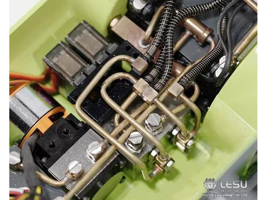 Sehr hochwertiges LESU-Modell eines Gabelstaplers im Massstab 1:14. Das Modell ist grösstenteils aus Metall gefertigt, die Hebe-/und Neigungsfunktion wird hydraulisch gesteuert. Der Stapler wird von einem Brushless-Motor über die Vorderachse angetrieben. Die Hinterachse wird über ein Servo gesteuert. Alle beweglichen Teile sind natürlich kugelgelagert.