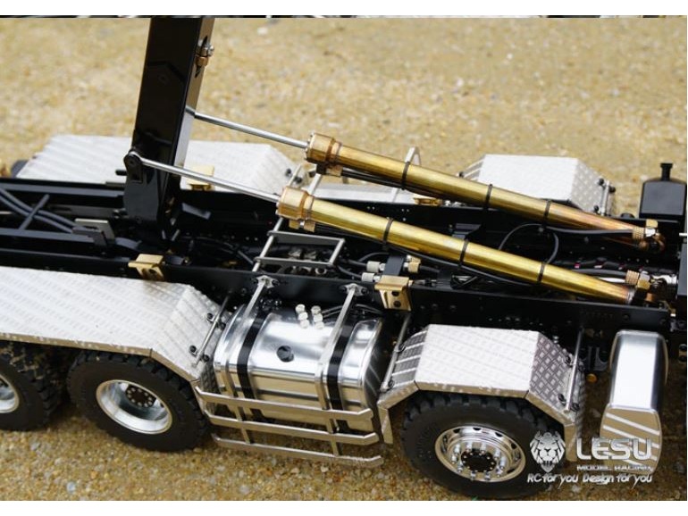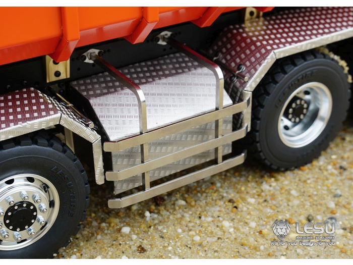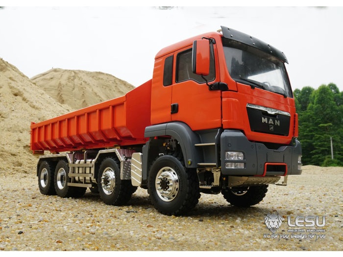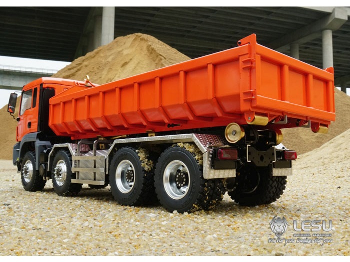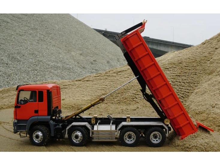 Dieser detaillierte Truck im MAN-Look verfügt über einen 8WD Antrieb mit hydraulisch betätigter Kippmulde im Tamiya-Massstab 1:14. Das Chassis und die Kippmulde wurden aus Aluminium gefertigt. Bis auf das Fahrerhaus ist das Modell komplett vormoniert.