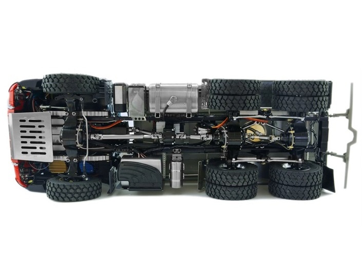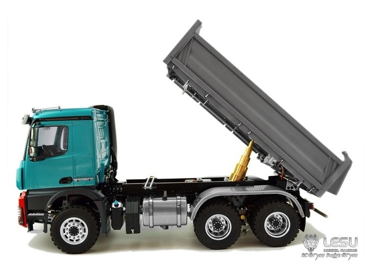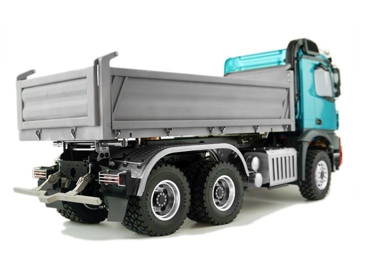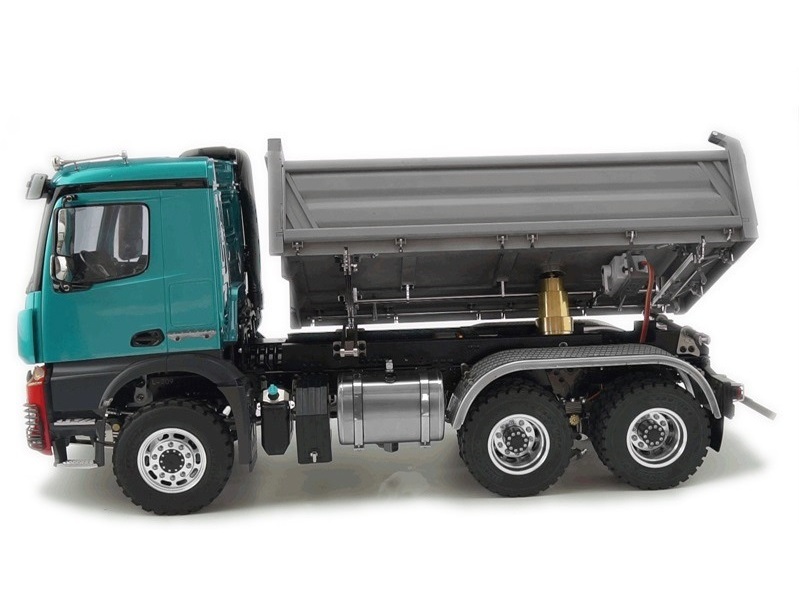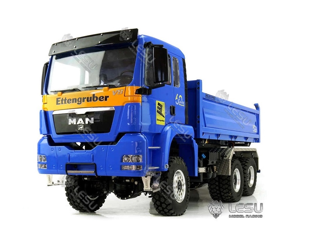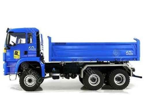 Dieser detaillierte Truck im MAN-Look verfügt über einen 6WD Antrieb mit hydraulisch betätigter Dreiseitenkippmulde im Tamiya-Massstab 1:14. Das Chassis und die Kippmulde wurden aus Aluminium gefertigt. Bis auf das Fahrerhaus ist das Modell komplett vormoniert.