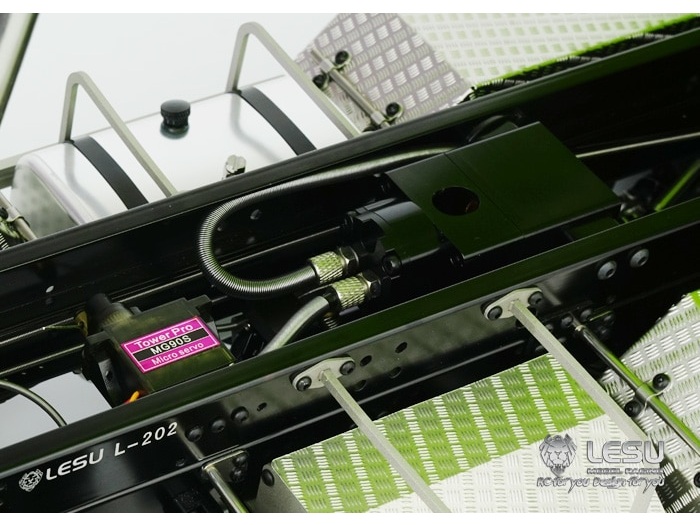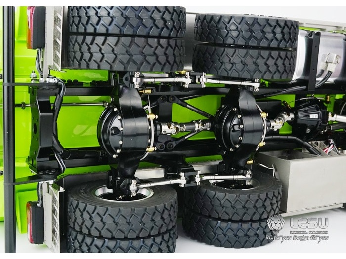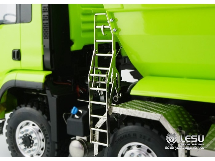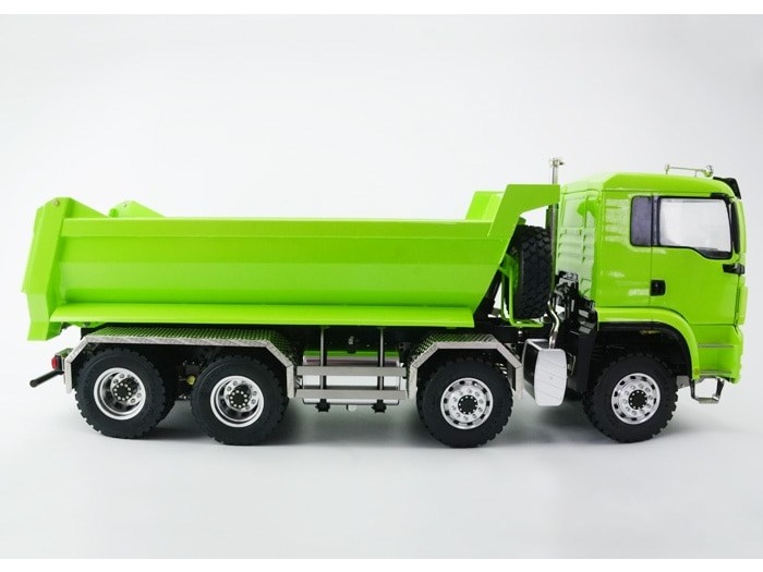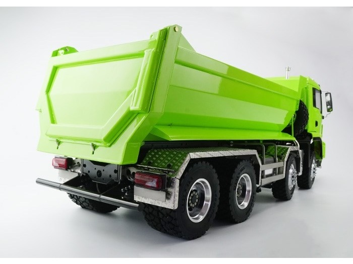 Dieser detaillierte Truck im MAN-Look verfügt über einen 8WD Antrieb mit hydraulisch betätigter Kippmulde im Tamiya-Massstab 1:14. Das Chassis und die Kippmulde wurden aus Aluminium gefertigt. Bis auf das Fahrerhaus ist das Modell komplett vormoniert.