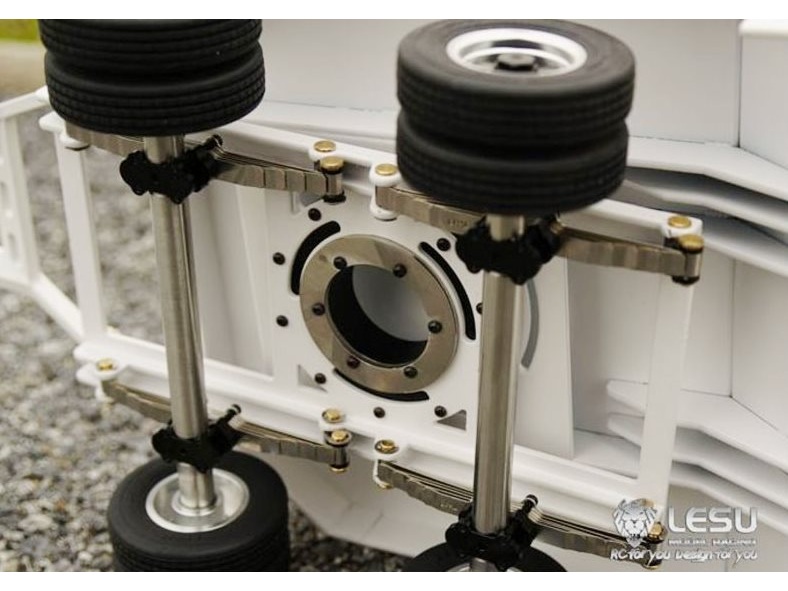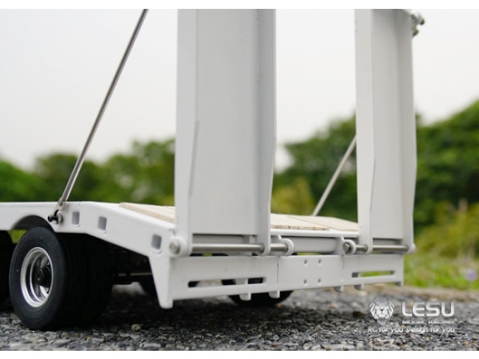 Sehr detaillierter und stabiler Tiefladeanhänger aus Edelstahl, praktisch fertig aufgebaut und inklusive Alufelgen. Dank den 5-Achsen mit Kugellagern kann der Tieflader bis zu 50kg problemlos transportieren.