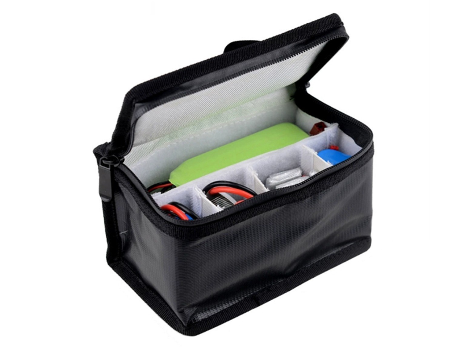 Praktische LiPo-Schutztasche mit flexibler Innenaufteilung zum sicheren Transport und zur Lagerung von LiPo-Akkus. Ideal geeignet zum Schutz vor mechanischen Einwirkungen und zur Minimierung von Risiken beim Laden und Lagern. Dank variabler Trennwände lässt sich der Innenraum individuell anpassen – perfekt für unterschiedlich grosse Akkus oder Zubehör.