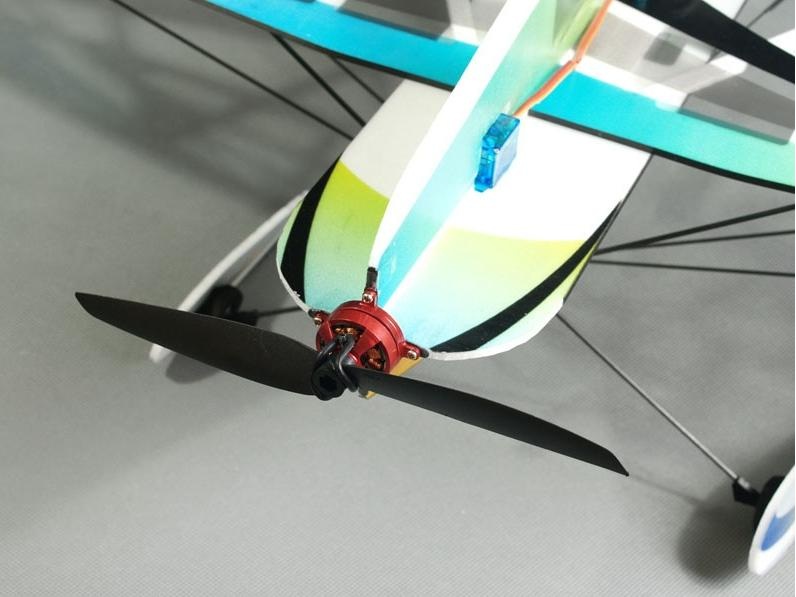 Indoor-Kunstflugmodell in neuartiger, professioneller Leichtbauweise. Der Flieger ist mit Kohlefaserleisten verstärkt und bereits mit leichter Folie bespannt.