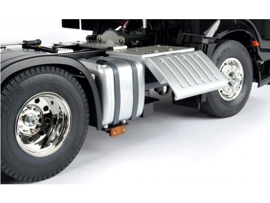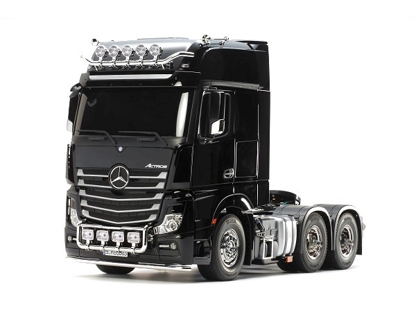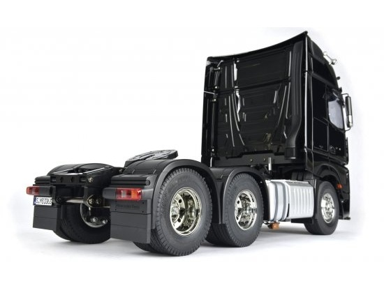 Der neuste Mercedes-Benz Actros 3363 6×4 GigaSpace darf zu Recht als König der Landstrasse bezeichnet werden. Mit Motoren bis zu 630PS und 3000Nm Drehmoment ist die Zugmaschine theoretisch fähig, bis zu 250 Tonnen Last zu ziehen. Die luxuriöse Kabine in der GigaSpace Variante ist das grösste lieferbare Fernverkehr-Fahrerhaus der Actros-Reihe und wurde beim vorliegenden Modell akribisch genau umgesetzt. Die zusätzliche Fahrzeugbeleuchtung verleiht der aggressiven Front dabei einen standesgemässen Auftritt. Wie beim Original sind beide Hinterachsen angetrieben, die Motorkraft wird beim Modell wie gewohnt über das bewährte 3-Ganggetriebe in Zugkraft umgesetzt. Das Ergebnis ist ein echter Truck der Superlative. Die vorbildgetreue Sattelplatte des ferngesteuerten Modells erlaubt das Koppeln mit zahlreichen TAMIYA und CARSON-MODEL SPORT Aufliegern.