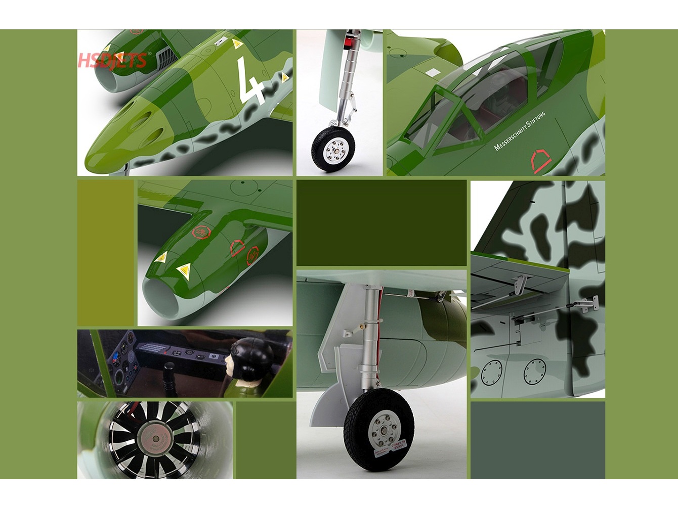 Das Modell aus hochfestem EPO-Foam ist weitgehend vorgefertigt und innert kurzer Zeit bereits flugfertig. Die ME-262 verfügt über funktionsfähige Landeklappen, ein gefedertes, elektrisches Aluminium-Einziehfahrwerk mit elektrischer Bremse und einer Scale-Beleuchtung. Alle Komponenten wie das gefederte Fahrwerk, die 90mm S-EDF Impeller-Einheiten mit Motor, die Regler und Servos sind bereits eingebaut.